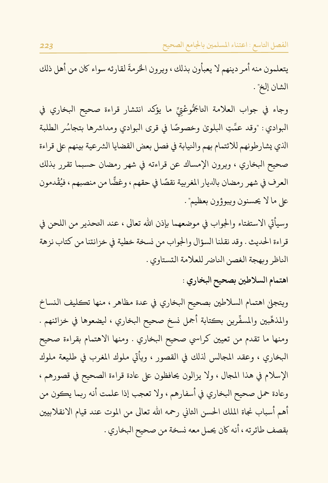 ويتجلى اهتمام السلاطين بصحيح البخاري في عدة مظاهر، منها تكليف النساخ والمذهِّبين والمسفِّرين بكتابة أجمل نسخ صحيح البخاري، ليضعوها في خزائنهم. ومنها ما تقدم من تعيين كراسي صحيح البخاري. ومنها الاهتمام بقراءة صحيح البخاري، وعقد المجالس لذلك في القصور، ويأتي ملوك المغرب في طليعة ملوك الإسلام في هذا المجال، ولا يزالون يحافظون على عادة قراءة الصحيح في قصورهم، وعادة حمل صحيح البخاري في أسفارهم، ولا تعجب إذا علمت أنه ربما يكون من أهم أسباب نجاة الملك الحسن الثاني رحمه الله تعالى من الموت عند قيام الانقلابيين بقصف طائرته، أنه كان يحمل معه نسخة من صحيح البخاري.