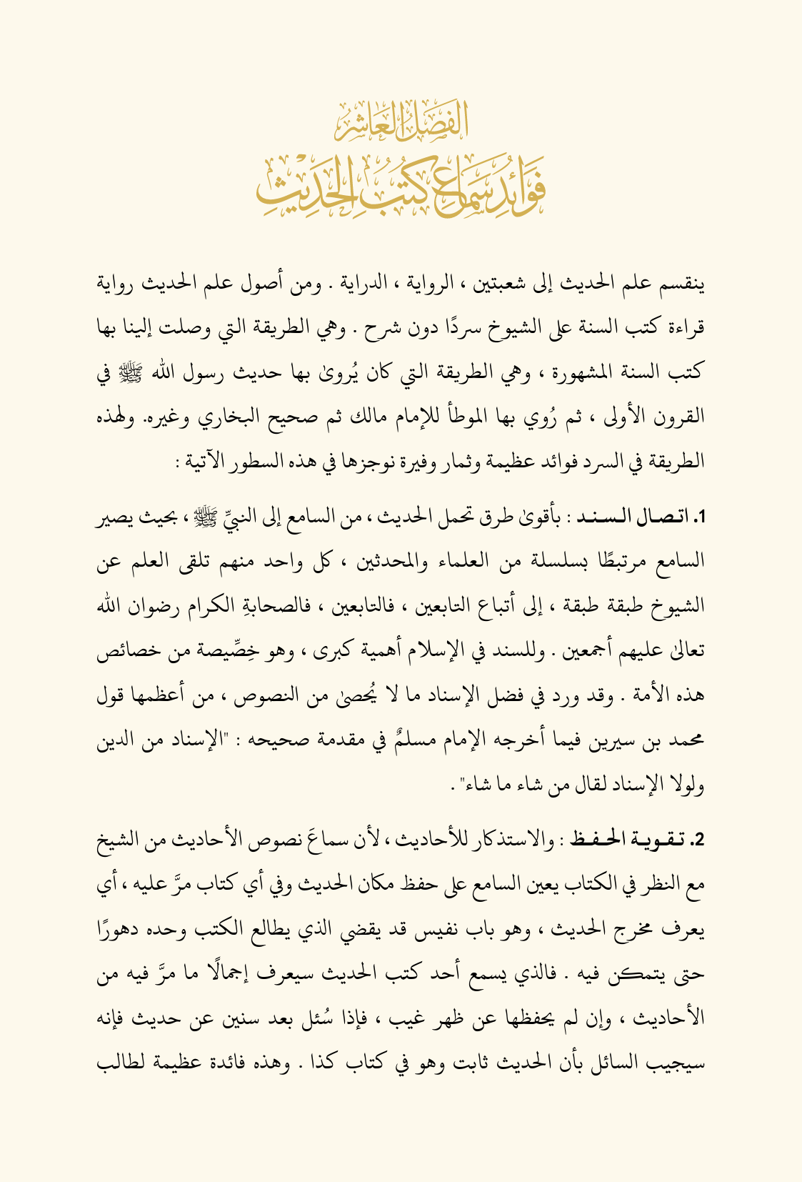 ١. اتصال السند: بأقوى طرق تحمل الحديث، من السامع إلى النبيِّ - صلى الله عليه وسلم -، بحيث يصير السامع مرتبطًا بسلسلة من العلماء والمحدثين، كل واحد منهم تلقى العلم عن الشيوخ طبقة طبقة، إلى أتباع التابعين، فالتابعين، فالصحابةِ الكرام رضوان الله تعالى عليهم أجمعين. وللسند في الإسلام أهمية كبرى، وهو خِصِّيصة من خصائص هذه الأمة. وقد ورد في فضل الإسناد ما لا يُحصى من النصوص، من أعظمها قول محمد بن سيرين فيما أخرجه الإمام مسلمٌ في مقدمة صحيحه: "الإسناد من الدين ولولا الإسناد لقال من شاء ما شاء".