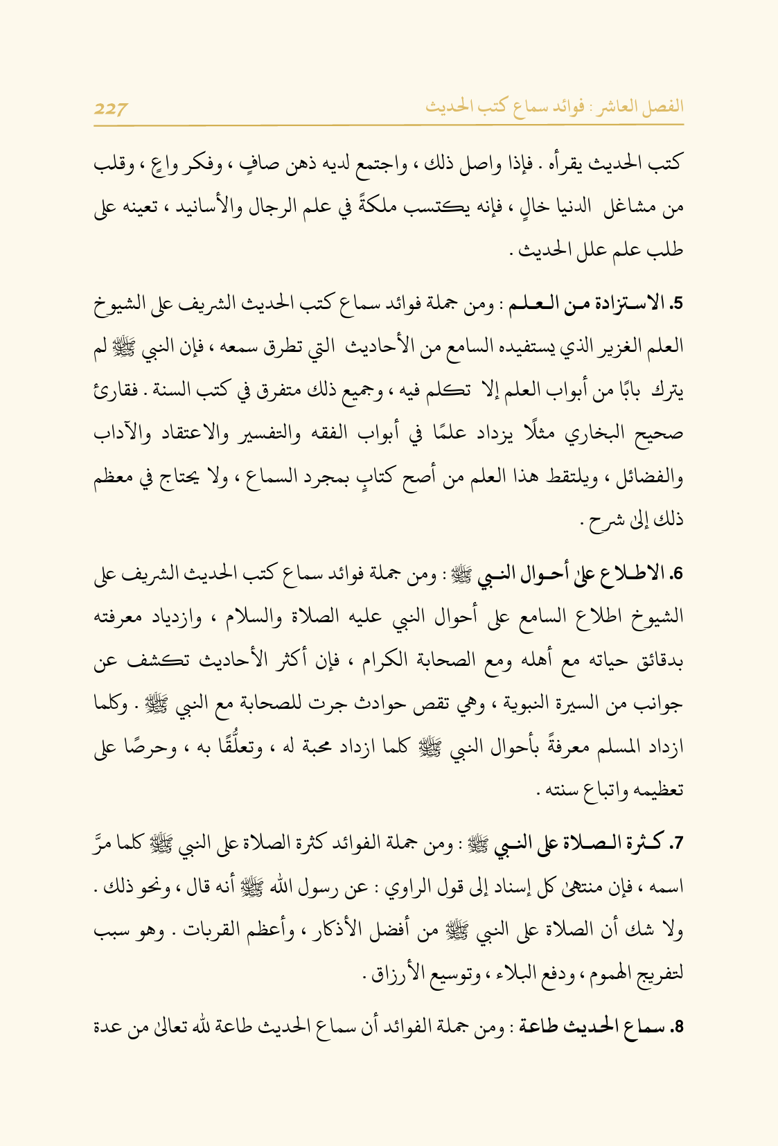 ٧. كثرة الصلاة على النبي - صلى الله عليه وسلم -: ومن جملة الفوائد كثرة الصلاة على النبي - صلى الله عليه وسلم - كلما مرَّ اسمه، فإن منتهى كل إسناد إلى قول الراوي: عن رسول الله - صلى الله عليه وسلم - أنه قال، ونحو ذلك. ولا شك أن الصلاة على النبي - صلى الله عليه وسلم - من أفضل الأذكار، وأعظم القربات. وهو سبب لتفريج الهموم، ودفع البلاء، وتوسيع الأرزاق.
