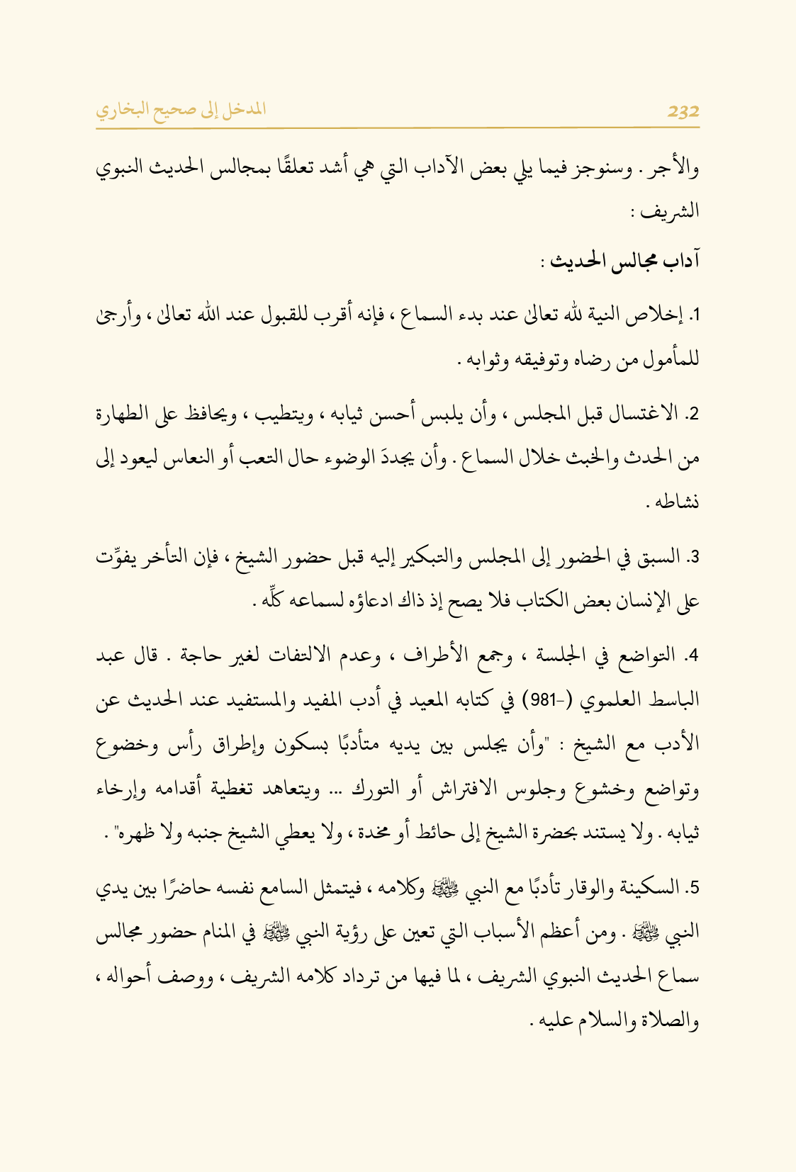 والأجر. وسنوجز فيما يلي بعض الآداب التي هي أشد تعلقًا بمجالس الحديث النبوي الشريف: