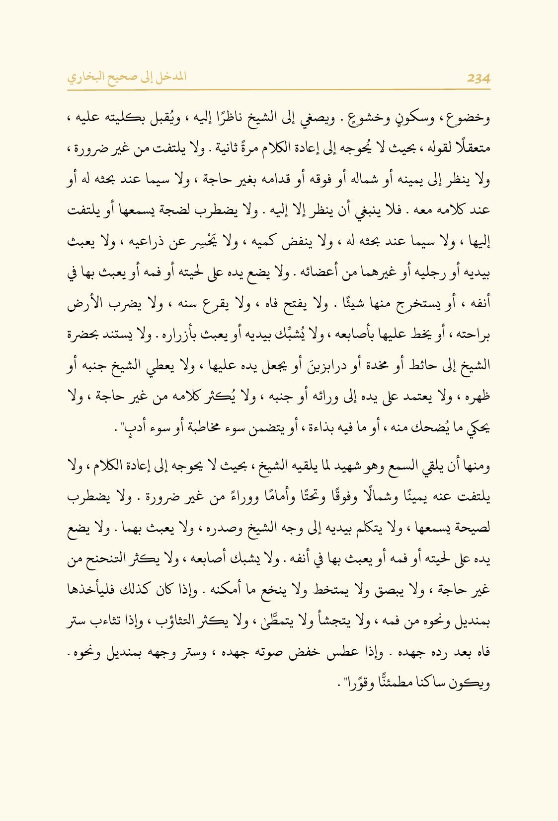 وخضوع.، وسكونٍ وخشوعٍ. ويصغي إلى الشيخ ناظرًا إليه، ويُقبل بكليته عليه، متعقلًا لقوله، بحيث لا يُحوجه إلى إعادة الكلام مرةً ثانية. ولا يلتفت من غير ضرورة، ولا ينظر إلى يمينه أو شماله أو فوقه أو قدامه بغير حاجة، ولا سيما عند بحثه له أو عند كلامه معه. فلا ينبغي أن ينظر إلا إليه. ولا يضطرب لضجة يسمعها أو يلتفت إليها، ولا سيما عند بحثه له، ولا ينفض كميه، ولا يَحْسِر عن ذراعيه، ولا يعبث بيديه أو رجليه أو غيرهما من أعضائه. ولا يضع يده على لحيته أو فمه أو يعبث بها في أنفه، أو يستخرج منها شيئًا. ولا يفتح فاه، ولا يقرع سنه، ولا يضرب الأرض براحته، أو يخط عليها بأصابعه، ولا يُشبِّك بيديه أو يعبث بأزراره. ولا يستند بحضرة الشيخ إلى حائط أو مخدة أو درابزينَ أو يجعل يده عليها، ولا يعطي الشيخ جنبه أو ظهره، ولا يعتمد على يده إلى ورائه أو جنبه، ولا يُكثر كلامه من غير حاجة، ولا يحكي ما يُضحك منه، أو ما فيه بذاءة، أو يتضمن سوء مخاطبة أو سوء أدبٍ".