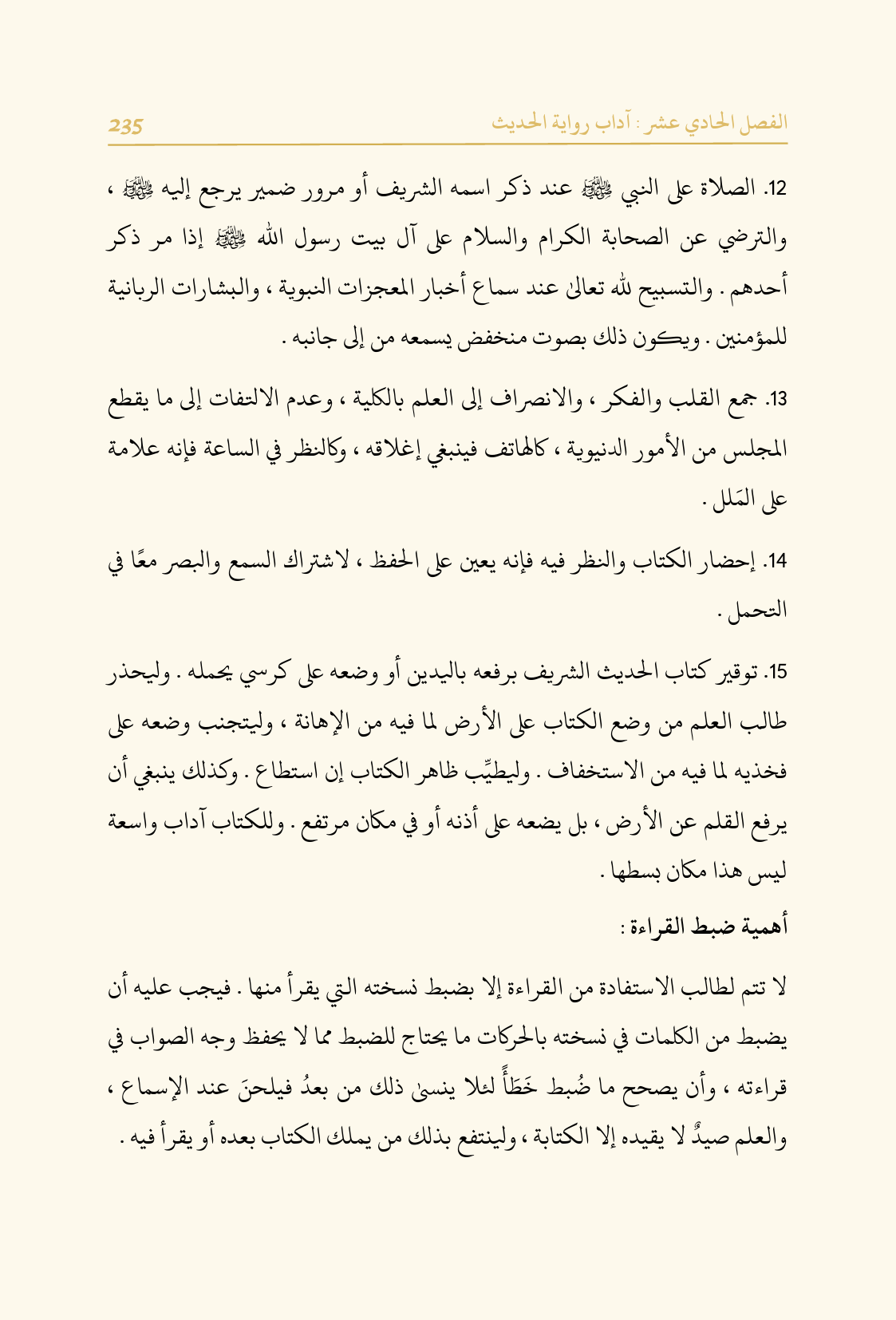 ١٥. توقير كتاب الحديث الشريف برفعه باليدين أو وضعه على كرسي يحمله. وليحذر طالب العلم من وضع الكتاب على الأرض لما فيه من الإهانة، وليتجنب وضعه على فخذيه لما فيه من الاستخفاف. وليطيِّب ظاهر الكتاب إن استطاع. وكذلك ينبغي أن يرفع القلم عن الأرض، بل يضعه على أذنه أو في مكان مرتفع. وللكتاب آداب واسعة ليس هذا مكان بسطها.