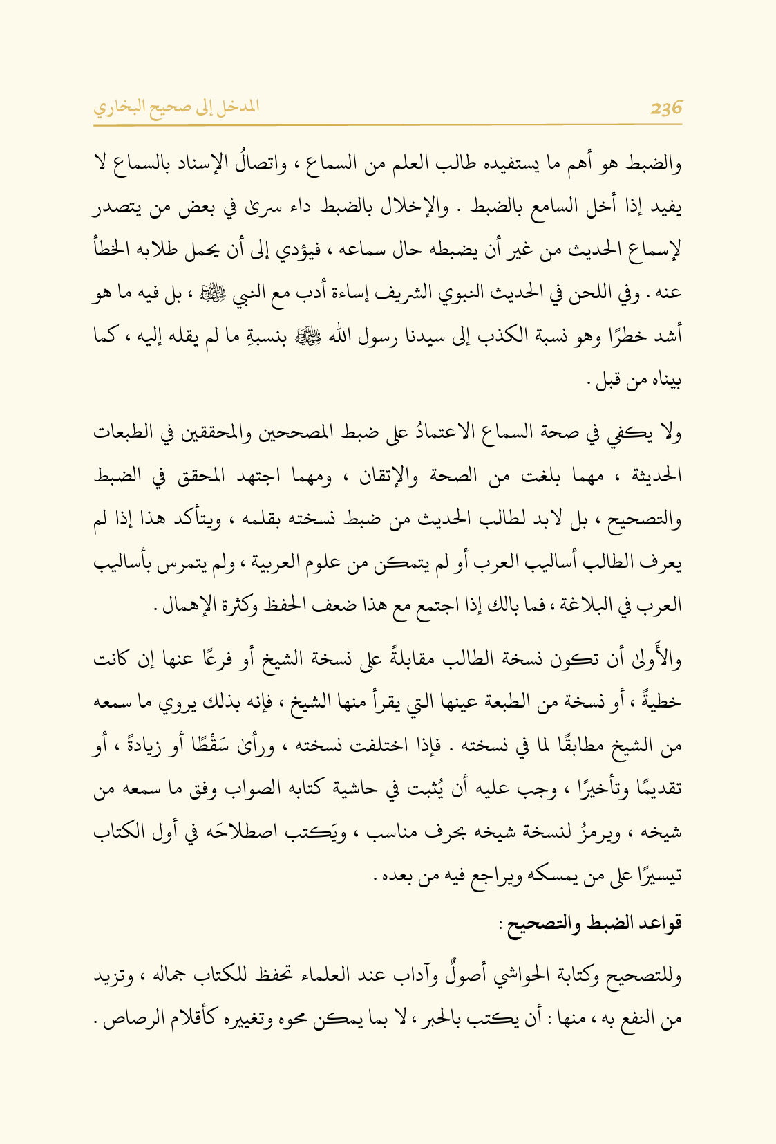 ولا يكفي في صحة السماع الاعتمادُ على ضبط المصححين والمحققين في الطبعات الحديثة، مهما بلغت من الصحة والإتقان، ومهما اجتهد المحقق في الضبط والتصحيح، بل لابد لطالب الحديث من ضبط نسخته بقلمه، ويتأكد هذا إذا لم يعرف الطالب أساليب العرب أو لم يتمكن من علوم العربية، ولم يتمرس بأساليب العرب في البلاغة، فما بالك إذا اجتمع مع هذا ضعف الحفظ وكثرة الإهمال.