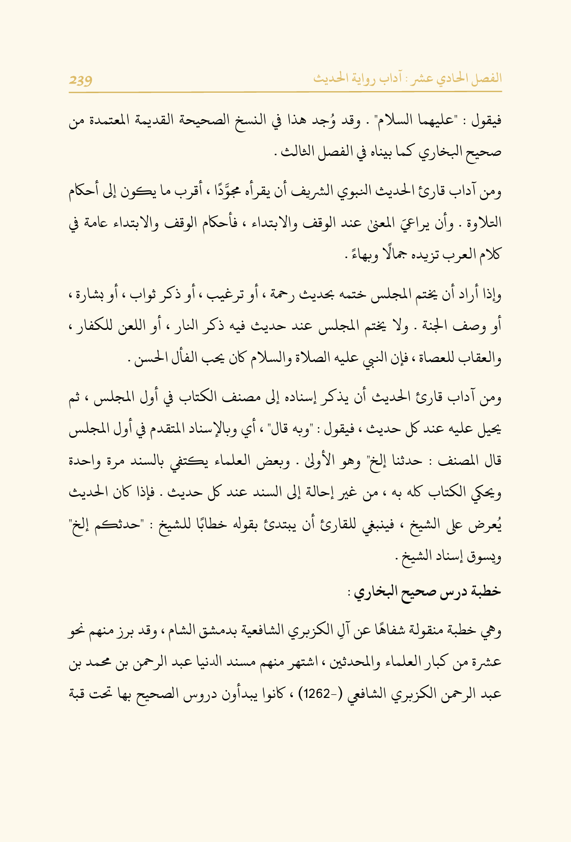 ومن آداب قارئ الحديث أن يذكر إسناده إلى مصنف الكتاب في أول المجلس، ثم يحيل عليه عند كل حديث، فيقول: "وبه قال"، أي وبالإسناد المتقدم في أول المجلس قال المصنف: حدثنا إلخ" وهو الأولى. وبعض العلماء يكتفي بالسند مرة واحدة ويحكي الكتاب كله به، من غير إحالة إلى السند عند كل حديث. فإذا كان الحديث يُعرض على الشيخ، فينبغي للقارئ أن يبتدئ بقوله خطابًا للشيخ: "حدثكم إلخ" ويسوق إسناد الشيخ.