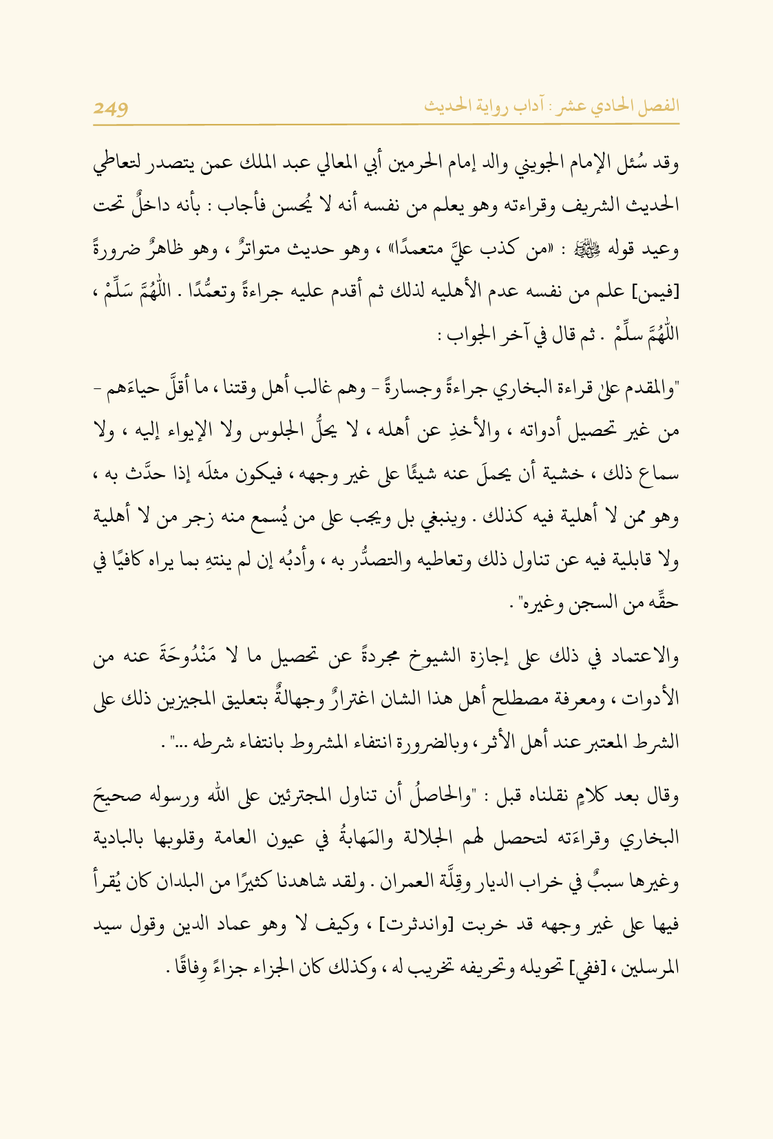 وقد سُئل الإمام الجويني والد إمام الحرمين أبي المعالي عبد الملك عمن يتصدر لتعاطي الحديث الشريف وقراءته وهو يعلم من نفسه أنه لا يُحسن فأجاب: بأنه داخلٌ تحت وعيد قوله - صلى الله عليه وسلم -: «من كذب عليَّ متعمدًا»، وهو حديث متواترٌ، وهو ظاهرٌ ضرورةً [فيمن] علم من نفسه عدم الأهليه لذلك ثم أقدم عليه جراءةً وتعمُّدًا. اللهم سَلِّمْ، اللهم سلِّمْ" .. ثم قال في آخر الجواب: