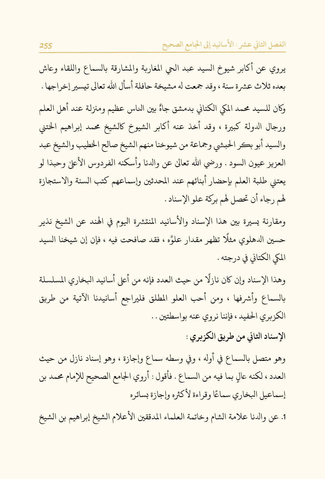 وهذا الإسناد وإن كان نازلًا من حيث العدد فإنه من أعلى أسانيد البخاري المسلسلة بالسماع وأشرفها، ومن أحب العلو المطلق فليراجع أسانيدنا الآتية من طريق الكزبري الحفيد، فإننا نروي عنه بواسطتين. .
