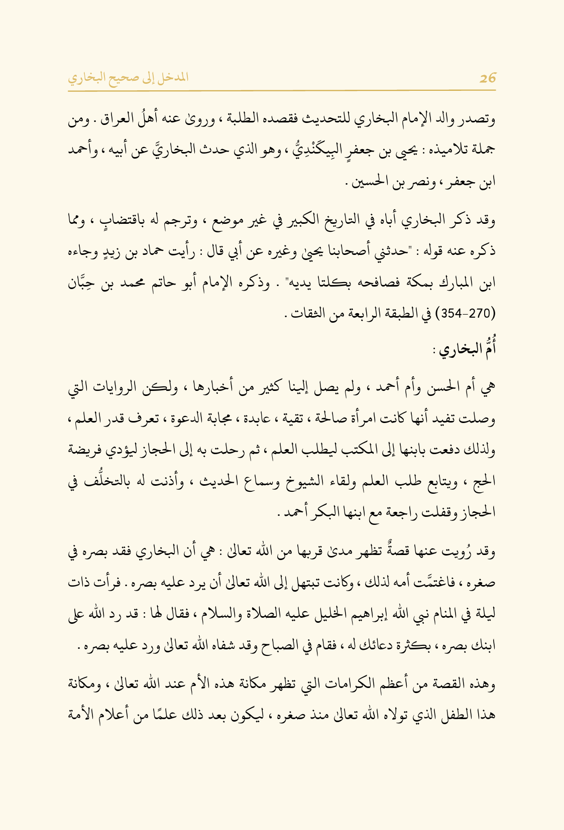 هي أم الحسن وأم أحمد، ولم يصل إلينا كثير من أخبارها، ولكن الروايات التي وصلت تفيد أنها كانت امرأة صالحة، تقية، عابدة، مجابة الدعوة، تعرف قدر العلم.، ولذلك دفعت بابنها إلى المكتب ليطلب العلم، ثم رحلت به إلى الحجاز ليؤدي فريضة الحج، ويتابع طلب العلم ولقاء الشيوخ وسماع الحديث، وأذنت له بالتخلُّف في الحجاز وقفلت راجعة مع ابنها البكر أحمد.
