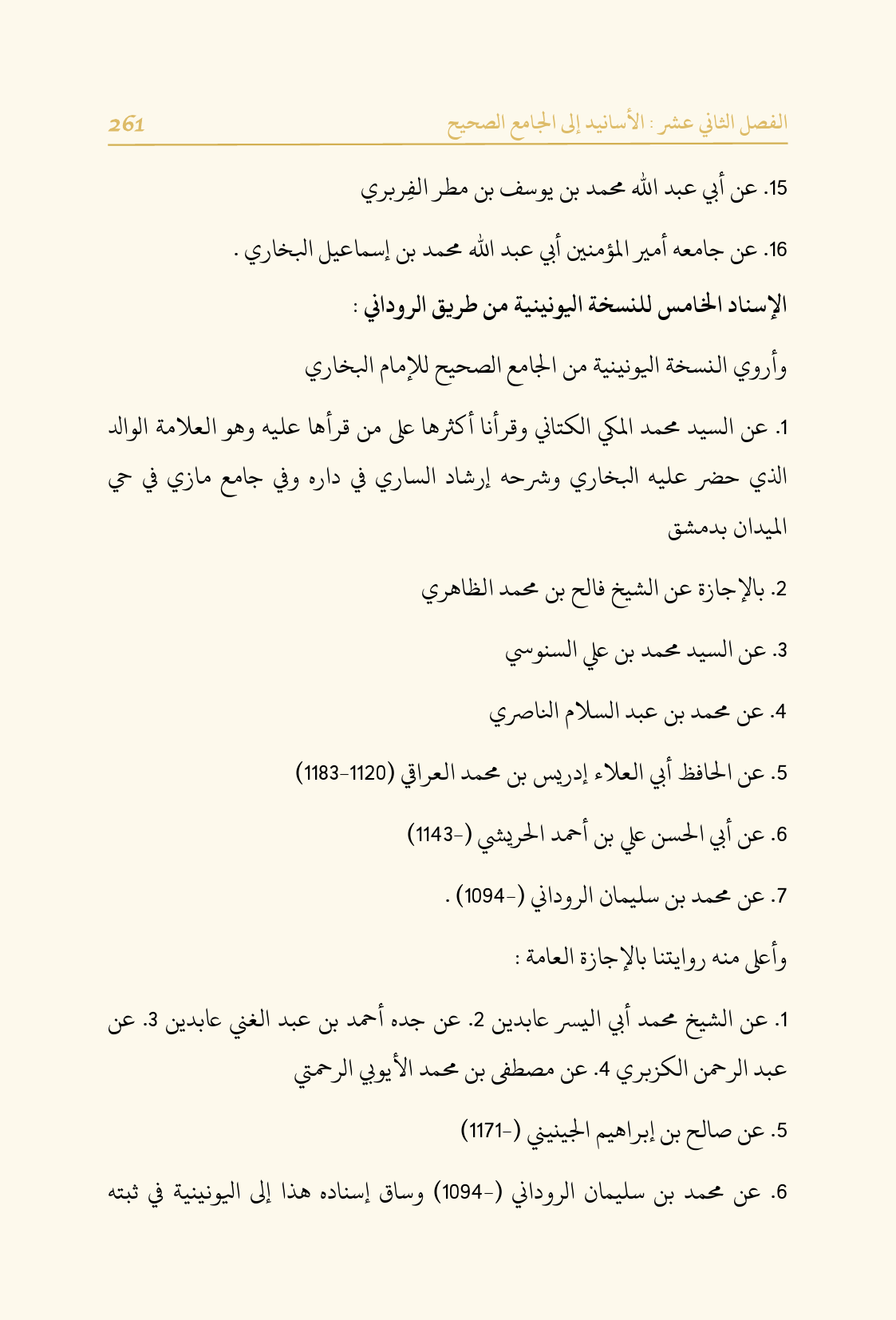 ١. عن السيد محمد المكي الكتاني وقرأنا أكثرها على من قرأها عليه وهو العلامة الوالد الذي حضر عليه البخاري وشرحه إرشاد الساري في داره وفي جامع مازي في حي الميدان بدمشق