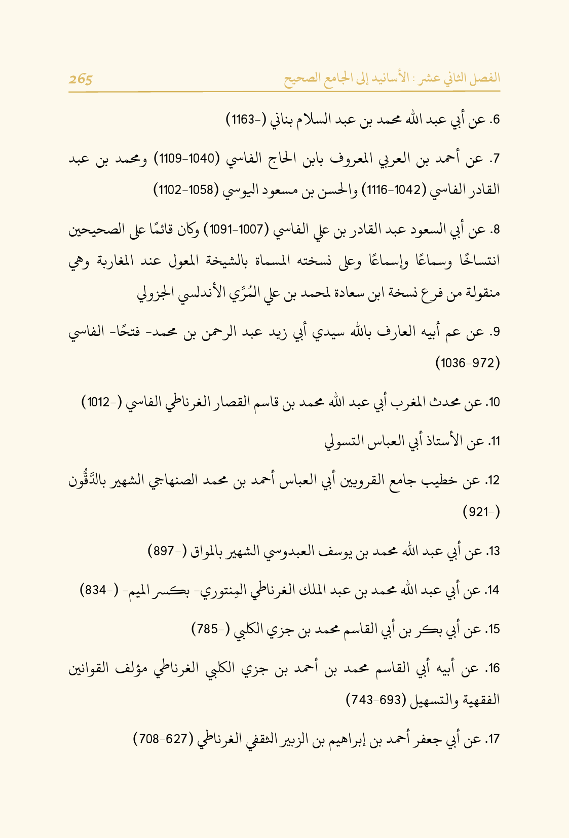 ٨. عن أبي السعود عبد القادر بن علي الفاسي (١٠٠٧ - ١٠٩١) وكان قائمًا على الصحيحين انتساخًا وسماعًا وإسماعًا وعلى نسخته المسماة بالشيخة المعول عند المغاربة وهي منقولة من فرع نسخة ابن سعادة لمحمد بن علي المُرِّي الأندلسي الجزولي