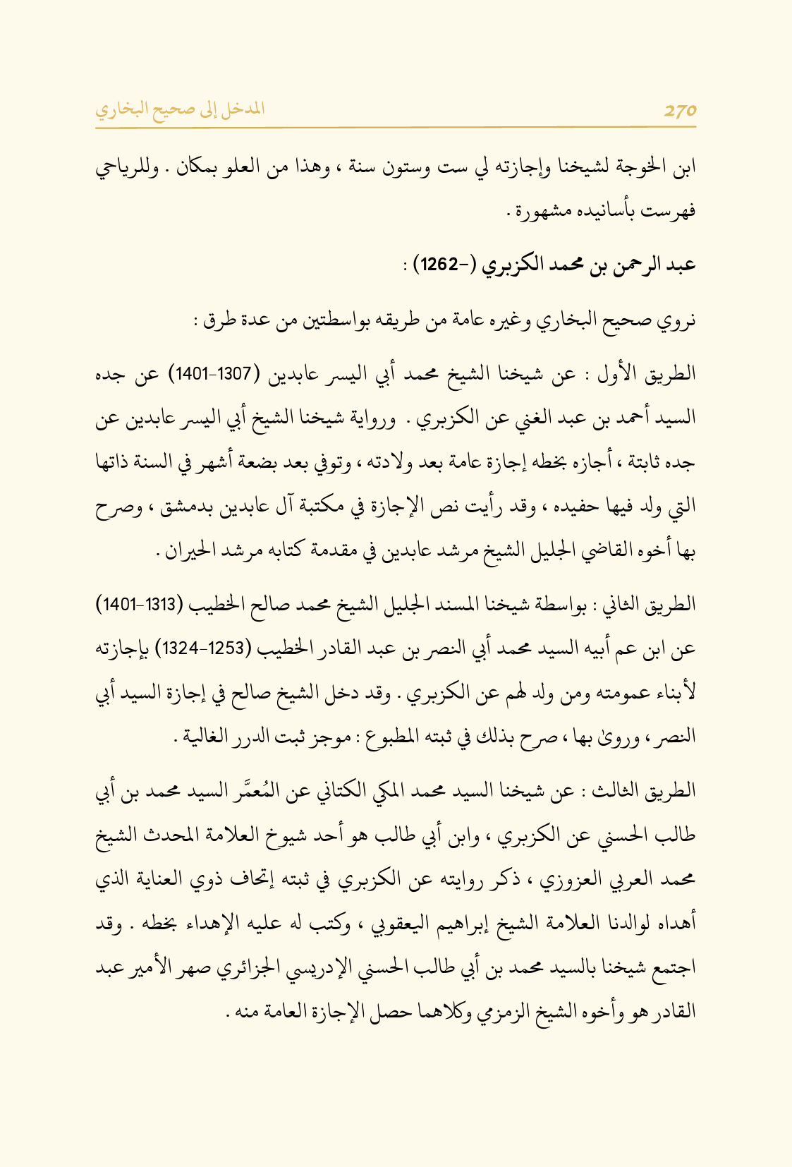 الطريق الأول: عن شيخنا الشيخ محمد أبي اليسر عابدين (١٣٠٧ - ١٤٠١) عن جده السيد أحمد بن عبد الغني عن الكزبري. ورواية شيخنا الشيخ أبي اليسر عابدين عن جده ثابتة، أجازه بخطه إجازة عامة بعد ولادته، وتوفي بعد بضعة أشهر في السنة ذاتها التي ولد فيها حفيده، وقد رأيت نص الإجازة في مكتبة آل عابدين بدمشق، وصرح بها أخوه القاضي الجليل الشيخ مرشد عابدين في مقدمة كتابه مرشد الحيران.