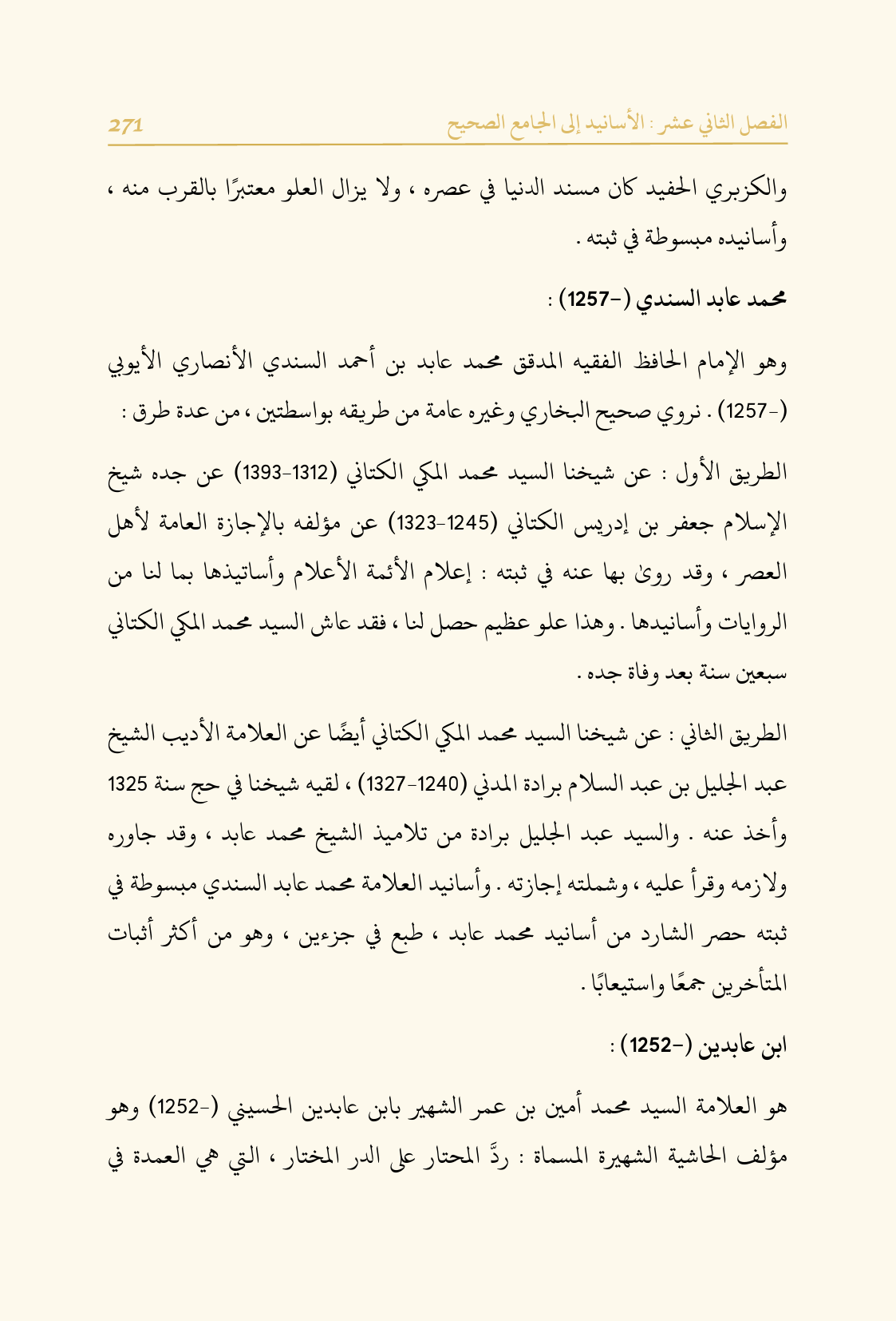 وهو الإمام الحافظ الفقيه المدقق محمد عابد بن أحمد السندي الأنصاري الأيوبي (-١٢٥٧). نروي صحيح البخاري وغيره عامة من طريقه بواسطتين، من عدة طرق.: