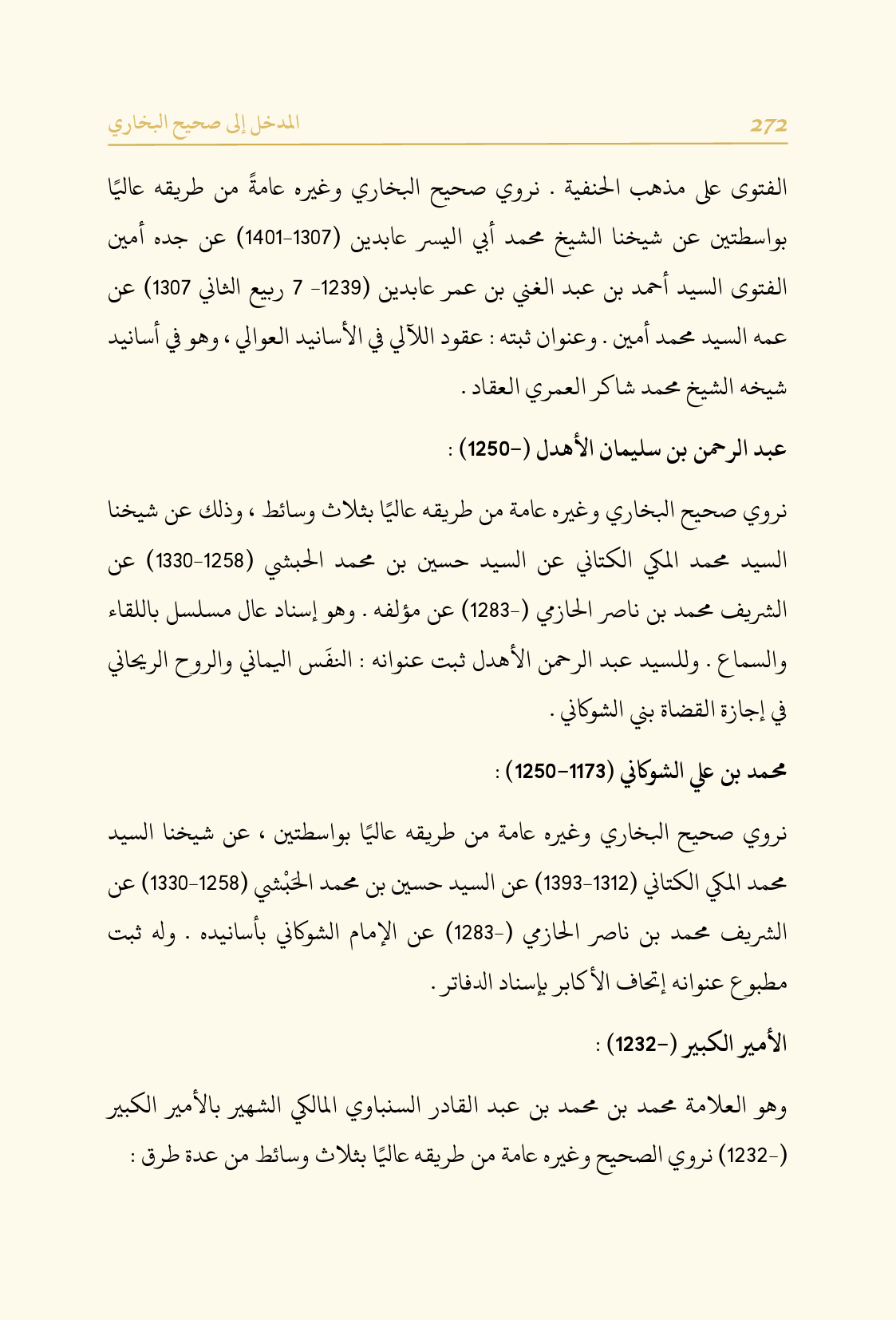 وهو العلامة محمد بن محمد بن عبد القادر السنباوي المالكي الشهير بالأمير الكبير (-١٢٣٢) نروي الصحيح وغيره عامة من طريقه عاليًا بثلاث وسائط من عدة طرق: