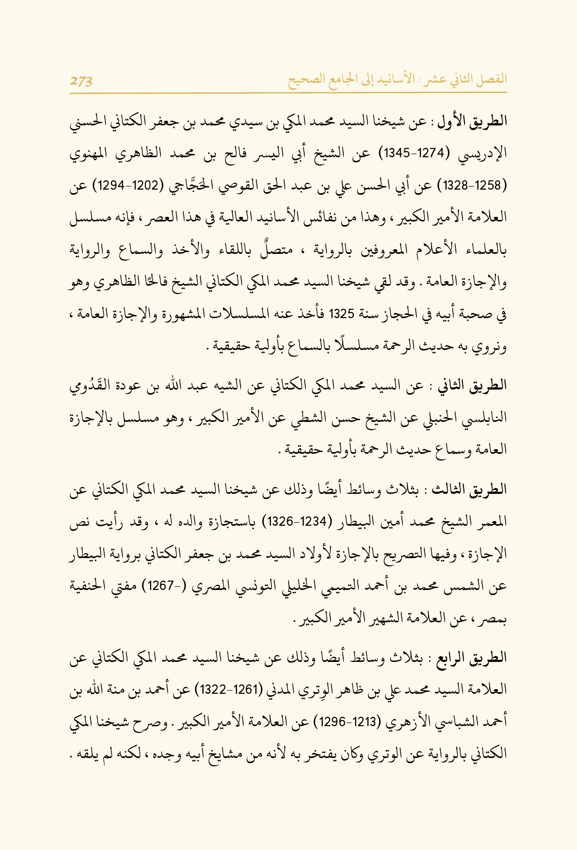 الطريق الرابع: بثلاث وسائط أيضًا وذلك عن شيخنا السيد محمد المكي الكتاني عن العلامة السيد محمد علي بن ظاهر الوِتري المدني (١٢٦١ - ١٣٢٢) عن أحمد بن منة الله بن أحمد الشباسي الأزهري (١٢١٣ - ١٢٩٦) عن العلامة الأمير الكبير. وصرح شيخنا المكي الكتاني بالرواية عن الوتري وكان يفتخر به لأنه من مشايخ أبيه وجده، لكنه لم يلقه.