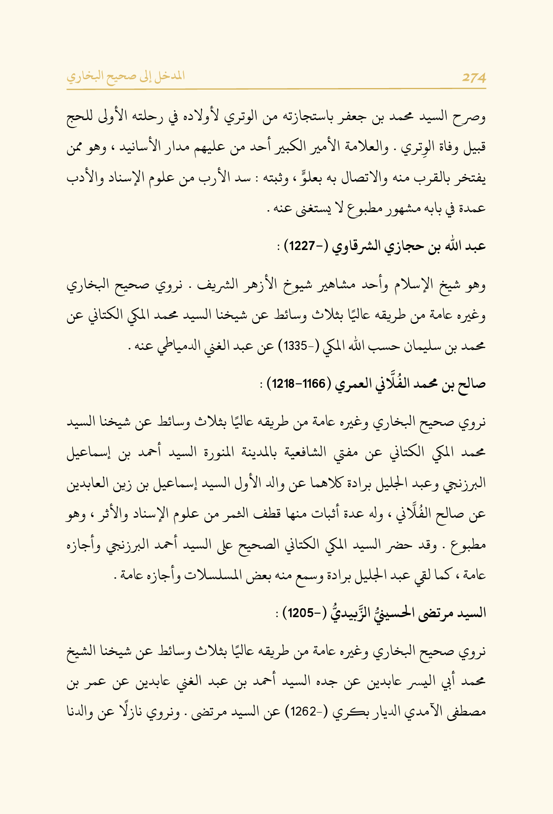 نروي صحيح البخاري وغيره عامة من طريقه عاليًا بثلاث وسائط عن شيخنا السيد محمد المكي الكتاني عن مفتي الشافعية بالمدينة المنورة السيد أحمد بن إسماعيل البرزنجي وعبد الجليل برادة كلاهما عن والد الأول السيد إسماعيل بن زين العابدين عن صالح الفُلَّاني، وله عدة أثبات منها قطف الثمر من علوم الإسناد والأثر، وهو مطبوع. وقد حضر السيد المكي الكتاني الصحيح على السيد أحمد البرزنجي وأجازه عامة، كما لقي عبد الجليل برادة وسمع منه بعض المسلسلات وأجازه عامة.