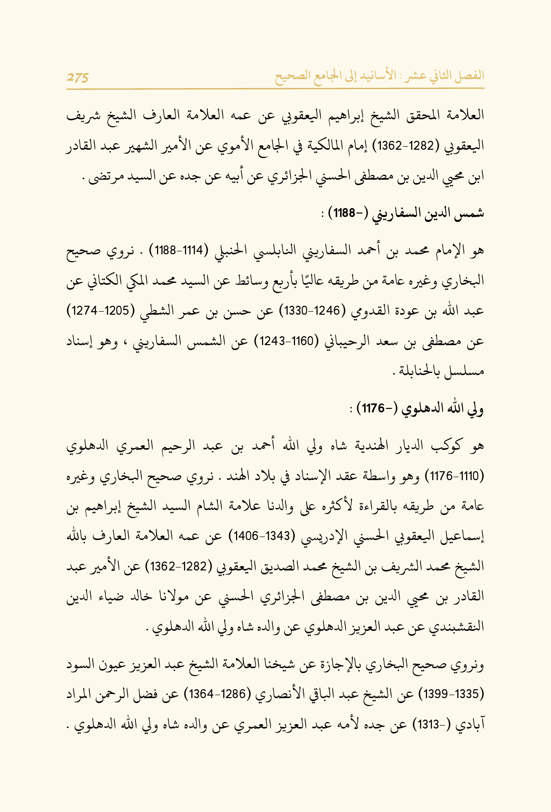 هو كوكب الديار الهندية شاه ولي الله أحمد بن عبد الرحيم العمري الدهلوي (١١١٠ - ١١٧٦) وهو واسطة عقد الإسناد في بلاد الهند. نروي صحيح البخاري وغيره عامة من طريقه بالقراءة لأكثره على والدنا علامة الشام السيد الشيخ إبراهيم بن إسماعيل اليعقوبي الحسني الإدريسي (١٣٤٣ - ١٤٠٦) عن عمه العلامة العارف بالله الشيخ محمد الشريف بن الشيخ محمد الصديق اليعقوبي (١٢٨٢ - ١٣٦٢) عن الأمير عبد القادر بن محيي الدين بن مصطفى الجزائري الحسني عن مولانا خالد ضياء الدين النقشبندي عن عبد العزيز الدهلوي عن والده شاه ولي الله الدهلوي.
