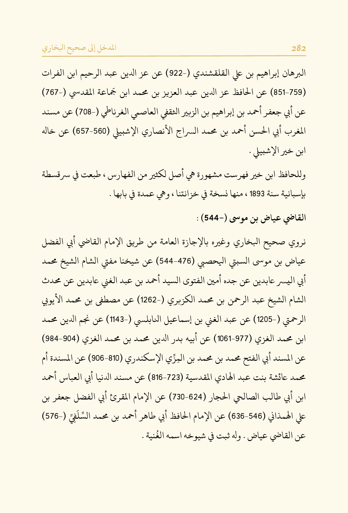 نروي صحيح البخاري وغيره بالإجازة العامة من طريق الإمام القاضي أبي الفضل عياض بن موسى السبتي اليحصبي (٤٧٦ - ٥٤٤) عن شيخنا مفتي الشام الشيخ محمد أبي اليسر عابدين عن جده أمين الفتوى السيد أحمد بن عبد الغني عابدين عن محدث الشام الشيخ عبد الرحمن بن محمد الكزبري (-١٢٦٢) عن مصطفى بن محمد الأيوبي الرحمتي (-١٢٠٥) عن عبد الغني بن إسماعيل النابلسي (-١١٤٣) عن نجم الدين محمد ابن محمد الغزي (٩٧٧ - ١٠٦١) عن أبيه بدر الدين محمد بن محمد الغزي (٩٠٤ - ٩٨٤) عن المسند أبي الفتح محمد بن محمد بن المِزِّي الإسكندري (٨١٠ - ٩٠٦) عن المسندة أم محمد عائشة بنت عبد الهادي المقدسية (٧٢٣ - ٨١٦) عن مسند الدنيا أبي العباس أحمد ابن أبي طالب الصالحي الحجار (٦٢٤ - ٧٣٠) عن الإمام المقرئ أبي الفضل جعفر بن علي الهمذاني (٥٤٦ - ٦٣٦) عن الإمام الحافظ أبي طاهر أحمد بن محمد السِّلَفِيِّ (-٥٧٦) عن القاضي عياض. وله ثبت في شيوخه اسمه الغُنية.