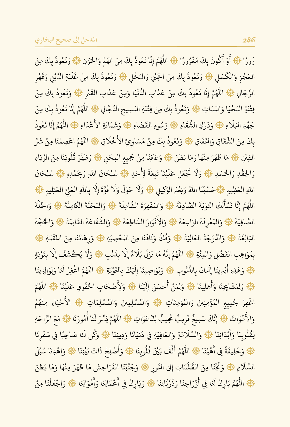 العَجْزِ وَالكَسَلِ وَنَعُوذُ بِكَ مِنَ الجُبْنِ وَالبُخْلِ وَنَعُوذُ بِكَ مِنْ غَلَبَةِ الدَّيْنِ وَقَهْرِ الرِّجَالِ اللهم إِنَّا نَعُوذُ بِكَ مِنْ عَذَابِ الدُّنْيَا وَمِنْ عَذَابِ القَبْرِ وَنَعُوذُ بِكَ مِنْ فِتْنَةِ المَحْيَا وَالمَمَاتِ وَنَعُوذُ بِكَ مِنْ فِتْنَةِ المَسِيحِ الدَّجَّالِ اللهم إِنَّا نَعُوذُ بِكَ مِنْ جَهْدِ البَلَاءِ وَدَرْكِ الشَّقَاءِ وَسُوءِ القَضَاءِ وَشَمَاتَةِ الأَعْدَاءِ اللهم إِنَّا نَعُوذُ بِكَ مِنَ الشِّقَاقِ وَالنِّفَاقِ وَنَعُوذُ بِكَ مِنْ مَسَاوِئِ الأَخْلَاقِ اللهم اعْصِمْنَا مِنْ شَرِّ الفِتَنِ مَا ظَهَرَ مِنْهَا وَمَا بَطَنَ وَعَافِنَا مِنْ جَمِيعِ المِحَنِ وَطَهِّرْ قُلُوبَنَا مِنَ الرِّيَاءِ وَالحِقْدِ وَالحَسَدِ وَلَا تَجْعَلْ عَلَيْنَا تَبِعَةً لِأَحَدٍ سُبْحَانَ اللهِ وَبِحَمْدِهِ سُبْحَانَ اللهِ العَظِيمِ حَسْبُنَا اللهُ وَنِعْمَ الوَكِيلِ وَلَا حَوْلَ وَلَا قُوَّةَ إِلَّا بِاللهِ العَلِيِّ العَظِيمِ اللهم إِنَّا نَسْأَلُكَ التَّوْبَةَ الصَّادِقَةَ وَالمَغْفِرَةَ الشَّامِلَةَ وَالمَحَبَّةَ الكَامِلَةَ وَالخُلَّةَ الصَّافِيَةَ وَالمَعْرِفَةَ الوَاسِعَةَ وَالأَنْوَارَ السَّاطِعَةَ وَالشَّفَاعَةَ القَائِمَةَ وَالحُجَّةَ البَالِغَةَ وَالدَّرَجَةَ العَالِيَةَ وَفُكَّ وَثَاقَنَا مِنَ المَعْصِيَةِ وَرِهَانَنَا مِنَ النِّقْمَةِ بِمَوَاهِبِ الفَضْلِ وَالمِنَّةِ اللهم إِنَّهُ مَا نَزَلَ بَلَاءٌ إِلَّا بِذَنْبٍ وَلَا يُكْشَفُ إِلَّا بِتَوْبَةٍ وَهَذِهِ أَيْدِينَا إِلَيْكَ بِالذُّنُوبِ وَنَوَاصِينَا إِلَيْكَ بِالتَّوْبَةِ اللهم اغْفِرْ لَنَا وَلِوَالِدِينَا وَلِمَشَايِخِنَا وَأَهْلِينَا وَلِمَنْ أَحْسَنَ إِلَيْنَا وَلِأَصْحَابِ الحُقُوقِ عَلَيْنَا اللهم اغْفِرْ لِجَمِيعِ المُؤْمِنِينَ وَالمُؤْمِنَاتِ