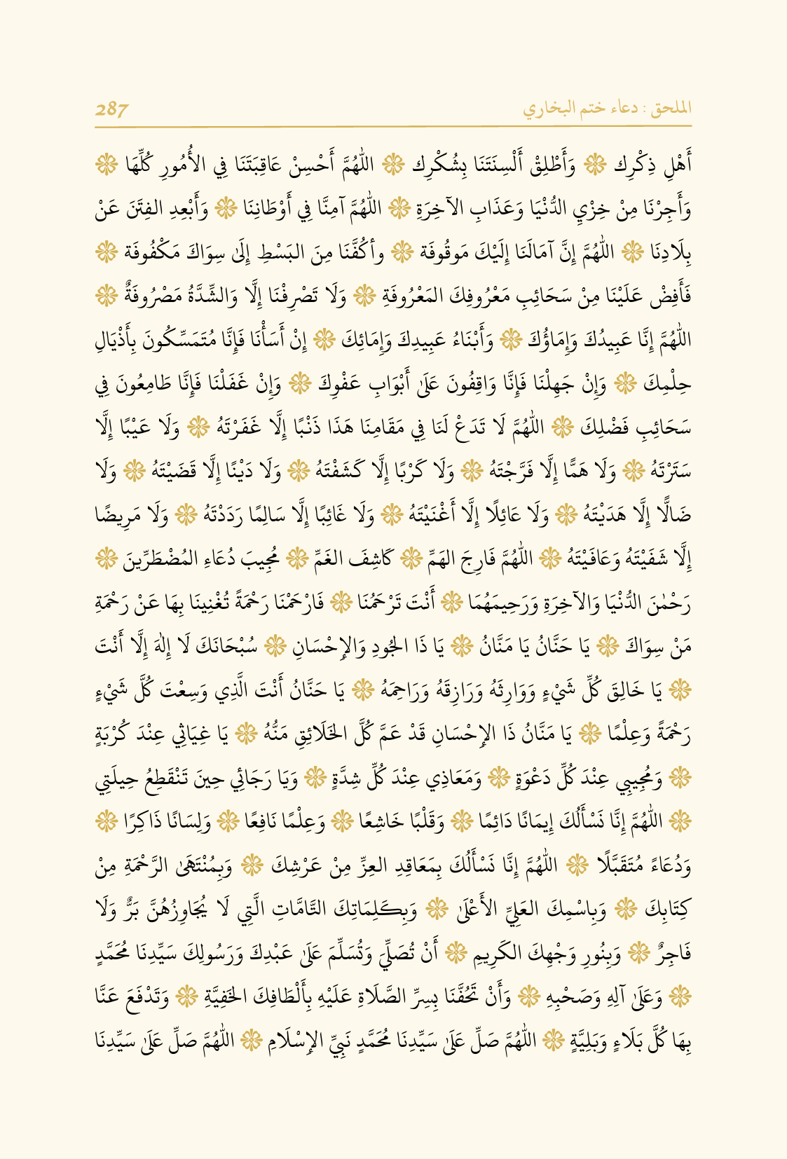 إِلَّا سَالِمًا رَدَدْتَهُ وَلَا مَرِيضًا إِلَّا شَفَيْتَهُ وَعَافَيْتَهُ اللهم فَارِجَ الهَمِّ كَاشِفَ الغَمِّ مُجِيبَ دُعَاءِ المُضْطَرِّينَ رَحْمنَ الدُّنْيَا وَالآخِرَةِ وَرَحِيمَهُمَا أَنْتَ تَرْحَمُنَا فَارْحَمْنَا رَحْمَةً تُغْنِينَا بِهَا عَنْ رَحْمَةِ مَنْ سِوَاكَ يَا حَنَّانُ يَا مَنَّانُ يَا ذَا الجُودِ وَالإِحْسَانِ سُبْحَانَكَ لَا إِلهَ إِلَّا أَنْتَ يَا خَالِقَ كُلِّ شَيْءٍ وَوَارِثَهُ وَرَازِقَهُ وَرَاحِمَهُ يَا حَنَّانُ أَنْتَ الَّذِي وَسِعْتَ كُلَّ شَيْءٍ رَحْمَةً وَعِلْمًا يَا مَنَّانُ ذَا الإِحْسَانِ قَدْ عَمَّ كُلَّ الخَلَائِقِ مَنُّهُ يَا غِيَاثِي عِنْدَ كُرْبَةٍ وَمُجِيبِي عِنْدَ كُلِّ دَعْوَةٍ وَمَعَاذِي عِنْدَ كُلِّ شِدَّةٍ وَيَا رَجَائِي حِينَ تَنْقَطِعُ حِيلَتِي اللهم إِنَّا نَسْأَلُكَ إِيمَانًا دَائِمًا وَقَلْبًا خَاشِعًا وَعِلْمًا نَافِعًا وَلِسَانًا ذَاكِرًا وَدُعَاءً مُتَقَبَّلًا اللهم إِنَّا نَسْأَلُكَ بِمَعَاقِدِ العِزِّ مِنْ عَرْشِكَ وَبِمُنْتَهَى الرَّحْمَةِ مِنْ كِتَابِكَ وَبِاسْمِكَ العَلِيِّ الأَعْلَى وَبِكَلِمَاتِكَ التَّامَّاتِ الَّتِي لَا يُجَاوِزُهُنَّ بَرٌّ وَلَا فَاجِرٌ وَبِنُورِ وَجْهِكَ الكَرِيمِ أَنْ تُصَلِّيَ وَتُسَلِّمَ عَلَى عَبْدِكَ وَرَسُولِكَ سَيِّدِنَا مُحَمَّدٍ وَعَلَى آلِهِ وَصَحْبِهِ وَأَنْ تَحُفَّنَا بِسِرِّ الصَّلَاةِ عَلَيْهِ بِأَلْطَافِكَ الخَفِيَّةِ وَتَدْفَعَ عَنَّا بِهَا كُلَّ بَلَاءٍ وَبَلِيَّةٍ اللهم صَلِّ عَلَى سَيِّدِنَا مُحَمَّدٍ نَبِيِّ الإِسْلَامِ اللهم صَلِّ عَلَى سَيِّدِنَا