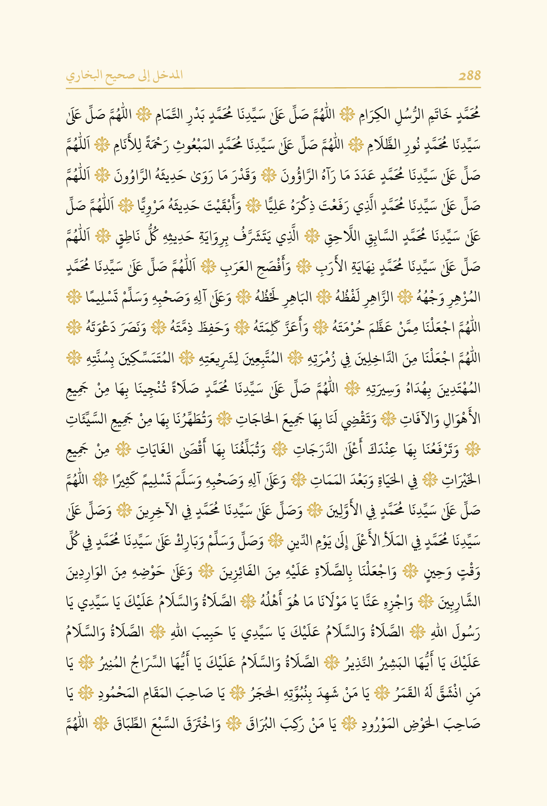 المَبْعُوثِ رَحْمَةً لِلأَنَامِ اللّاهُمَّ صَلِّ عَلَى سَيِّدِنَا مُحَمَّدٍ عَدَدَ مَا رَأَىهُ الرَّاؤُونَ وَقَدْرَ مَا رَوَى حَدِيثَهُ الرَّاوُونَ اللّاهُمَّ صَلِّ عَلَى سَيِّدِنَا مُحَمَّدٍ الَّذِي رَفَعْتَ ذِكْرَهُ عَلِيًّا وَأَبْقَيْتَ حَدِيثَهُ مَرْوِيًّا اللّاهُمَّ صَلِّ عَلَى سَيِّدِنَا مُحَمَّدٍ السَّابِقِ اللَّاحِقِ الَّذِي يَتَشَرَّفُ بِرِوَايَةِ حَدِيثِهِ كُلُّ نَاطِقٍ اللّاهُمَّ صَلِّ عَلَى سَيِّدِنَا مُحَمَّدٍ نِهَايَةِ الأَرَبِ وَأَفْصَحِ العَرَبِ اللّاهُمَّ صَلِّ عَلَى سَيِّدِنَا مُحَمَّدٍ المُزْهِرِ وَجْهُهُ الزَّاهِرِ لَفْظُهُ البَاهِرِ لَحْظُهُ وَعَلَى آلِهِ وَصَحْبِهِ وَسَلِّمْ تَسْلِيمًا اللهم اجْعَلْنَا مِمَّنْ عَظَّمَ حُرْمَتَهُ وَأَعَزَّ كَلِمَتَهُ وَحَفِظَ ذِمَّتَهُ وَنَصَرَ دَعْوَتَهُ اللهم اجْعَلْنَا مِنَ الدَّاخِلِينَ فِي زُمْرَتِهِ المُتَّبِعِينَ لِشَرِيعَتِهِ المُتَمَسِّكِينَ بِسُنَّتِهِ المُهْتَدِينَ بِهُدَاهُ وَسِيرَتِهِ اللهم صَلِّ عَلَى سَيِّدِنَا مُحَمَّدٍ صَلَاةً تُنْجِينَا بِهَا مِنْ جَمِيعِ الأَهْوَالِ وَالآفَاتِ وَتَقْضِي لَنَا بِهَا جَمِيعَ الحَاجَاتِ وَتُطَهِّرُنَا بِهَا مِنْ جَمِيعِ السَّيِّئَاتِ وَتَرْفَعُنَا بِهَا عِنْدَكَ أَعْلَى الدَّرَجَاتِ وَتُبَلِّغُنَا بِهَا أَقْصَى الغَايَاتِ مِنْ جَمِيعِ الخَيْرَاتِ فِي الحَيَاةِ وَبَعْدَ المَمَاتِ وَعَلَى آلِهِ وَصَحْبِهِ وَسَلَّمَ تَسْلِيمً كَثِيرًا اللهم صَلِّ عَلَى سَيِّدِنَا مُحَمَّدٍ فِي الأَوَّلِينَ وَصَلِّ عَلَى سَيِّدِنَا مُحَمَّدٍ فِي الآخِرِينَ وَصَلِّ عَلَى سَيِّدِنَا مُحَمَّدٍ فِي المَلَأِ الأَعْلَى إِلَى يَوْمِ الدِّينِ وَصَلِّ وَسَلِّمْ وَبَارِكْ عَلَى سَيِّدِنَا مُحَمَّدٍ فِي كُلِّ وَقْتٍ وَحِينٍ وَاجْعَلْنَا بِالصَّلَاةِ عَلَيْهِ مِنَ