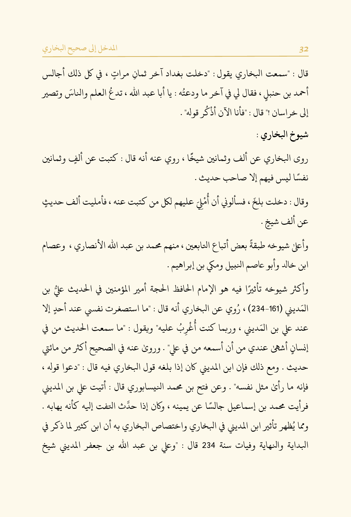 وأكثر شيوخه تأثيرًا فيه هو الإمام الحافظ الحجة أمير المؤمنين في الحديث عليُّ بن المَديني (١٦١ - ٢٣٤)، رُوي عن البخاري أنه قال: "ما استصغرت نفسي عند أحدٍ إلا عند علي بن المَديني، وربما كنت أُغْرِبُ عليه" ويقول: "ما سمعت الحديث من في إنسانٍ أشهى عندي من أن أسمعه من في علي". وروى عنه في الصحيح أكثر من مائتي حديث. ومع ذلك فإن ابن المديني كان إذا بلغه قول البخاري فيه قال: "دعوا قوله، فإنه ما رأى مثل نفسه". وعن فتح بن محمد النيسابوري قال: أتيت علي بن المديني فرأيت محمد بن إسماعيل جالسًا عن يمينه، وكان إذا حدَّث التفت إليه كأنه يهابه. ومما يُظهر تأثير ابن المديني في البخاري واختصاص البخاري به أن ابن كثير لما ذكر في البداية والنهاية وفيات سنة ٢٣٤ قال: "وعلي بن عبد الله بن جعفر المديني شيخ