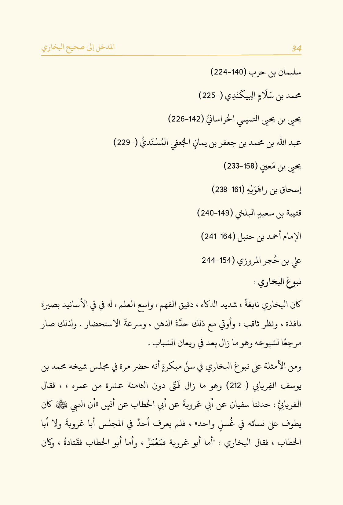 ومن الأمثلة على نبوغ البخاري في سنٍّ مبكرةٍ أنه حضر مرة في مجلس شيخه محمد بن يوسف الفِريابي (-٢١٢) وهو ما زال فَتًى دون الثامنة عشرة من عمره، ، فقال الفريابيُّ.: حدثنا سفيان عن أبي عَروبةَ عن أبي الخطاب عن أنسٍ «أن النبي - صلى الله عليه وسلم - كان يطوف على نسائه في غُسلٍ واحد»، فلم يعرف أحدٌ في المجلس أبا عَروبةَ ولا أبا الخطاب، فقال البخاري: "أما أبو عَروبة فمَعْمَرٌ، وأما أبو الخطاب فقَتادةُ، وكان