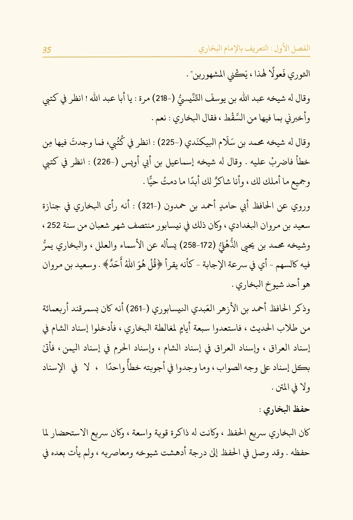 وروي عن الحافظ أبي حامدٍ أحمد بن حمدون (-٣٢١): أنه رأى البخاري في جنازة سعيد بن مروان البغدادي، وكان ذلك في نيسابور منتصف شهر شعبان من سنة ٢٥٢.، وشيخه محمد بن يحيى الذُّهْليُّ (١٧٢ - ٢٥٨) يسأله عن الأسماء والعلل، والبخاري يمرُّ فيه كالسهم - أي في سرعة الإجابة - كأنه يقرأ {قُلْ هُوَ اللهُ أَحَدٌ}. وسعيد بن مروان هو أحد شيوخ البخاري.