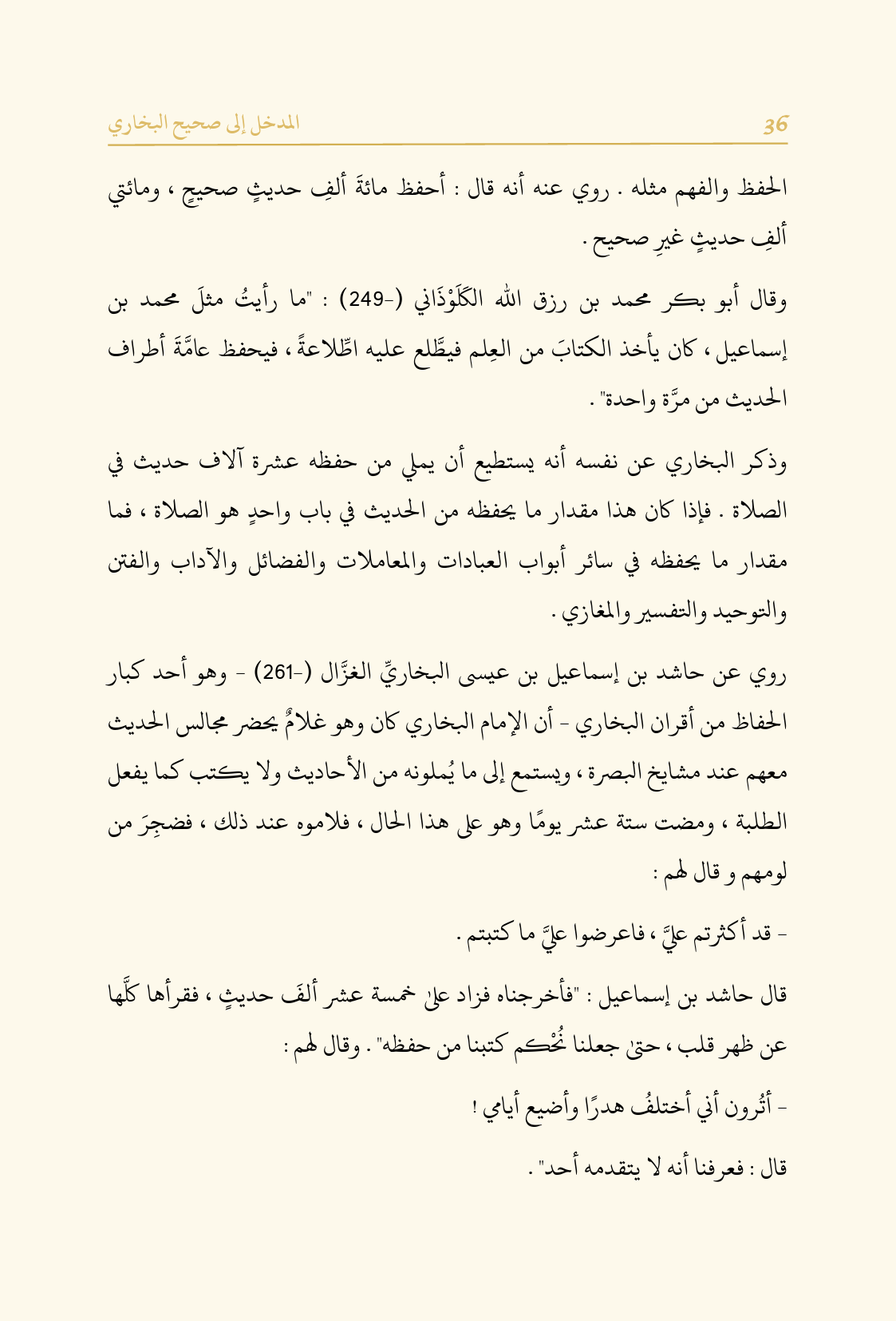 وذكر البخاري عن نفسه أنه يستطيع أن يملي من حفظه عشرة آلاف حديث في الصلاة. فإذا كان هذا مقدار ما يحفظه من الحديث في باب واحدٍ هو الصلاة، فما مقدار ما يحفظه في سائر أبواب العبادات والمعاملات والفضائل والآداب والفتن والتوحيد والتفسير والمغازي.