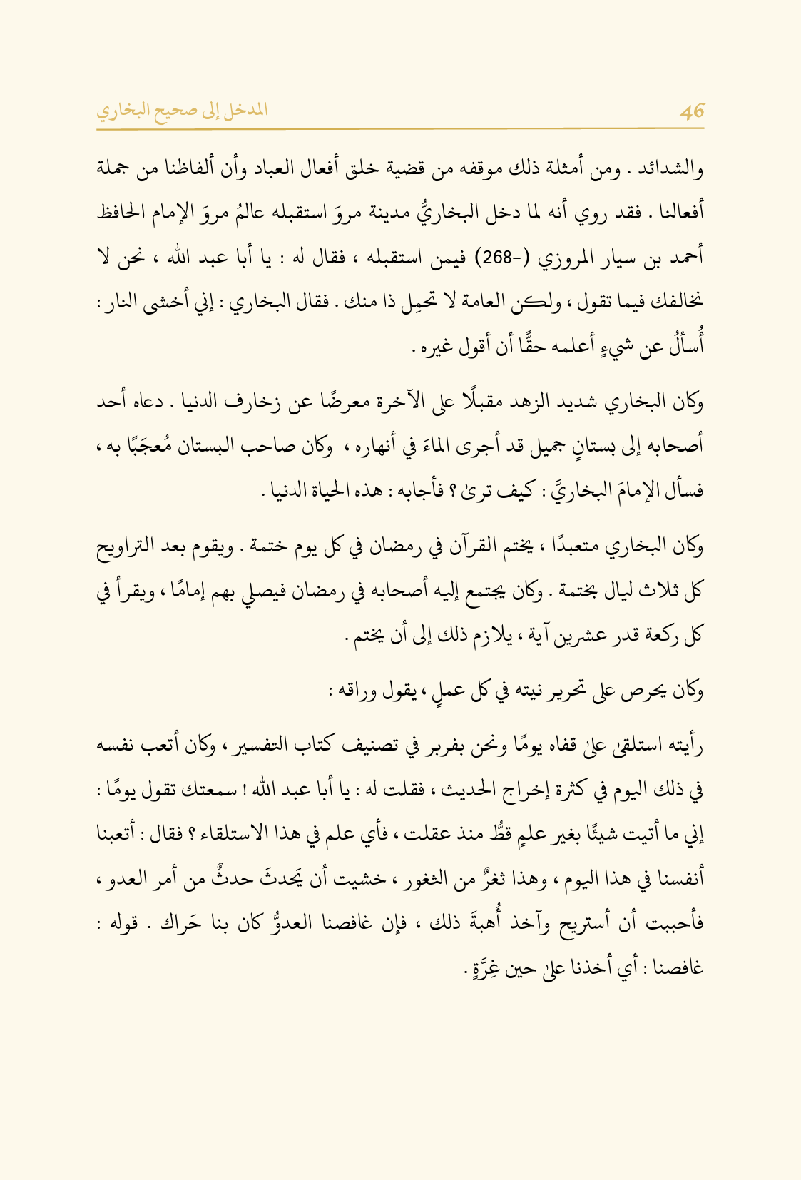 والشدائد. ومن أمثلة ذلك موقفه من قضية خلق أفعال العباد وأن ألفاظنا من جملة أفعالنا. فقد روي أنه لما دخل البخاريُّ مدينة مروَ استقبله عالمُ مروَ الإمام الحافظ أحمد بن سيار المروزي (-٢٦٨) فيمن استقبله، فقال له: يا أبا عبد الله، نحن لا نخالفك فيما تقول، ولكن العامة لا تحمِل ذا منك. فقال البخاري: إني أخشى النار: أُسألُ عن شيءٍ أعلمه حقًّا أن أقول غيره.