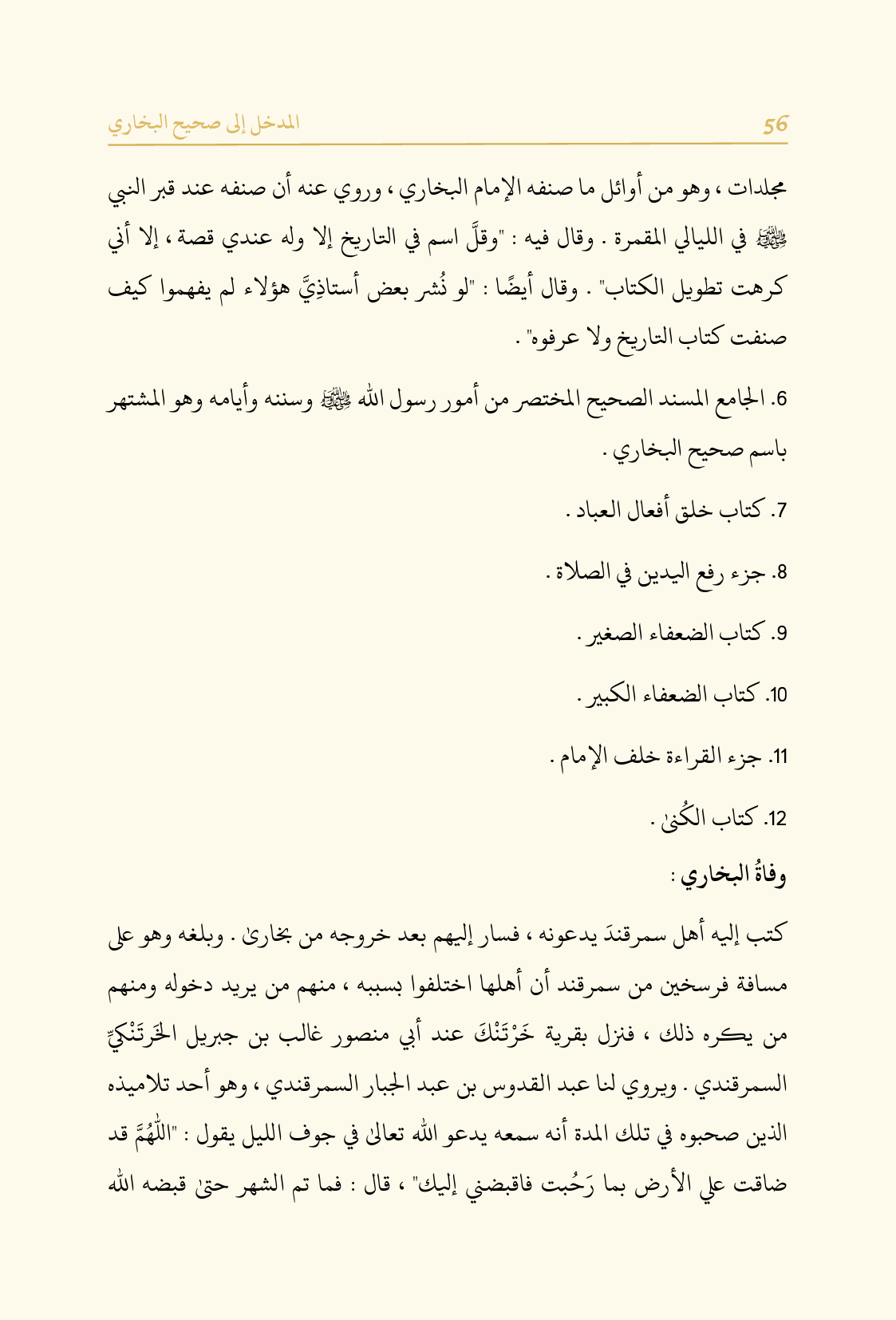 ٦. الجامع المسند الصحيح المختصر من أمور رسول الله - صلى الله عليه وسلم - وسننه وأيامه وهو المشتهر باسم صحيح البخاري.