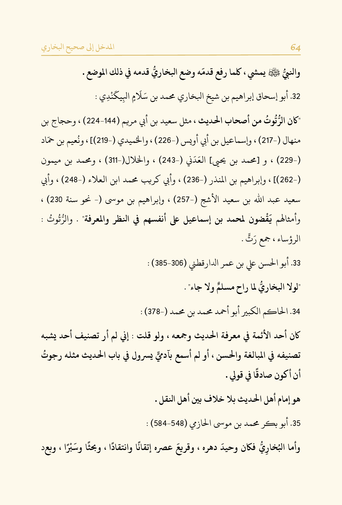 "كان الرُّتُوتُ من أصحاب الحديث، مثل سعيد بن أبي مريم (١٤٤ - ٢٢٤)، وحجاج بن منهال (-٢١٧)، وإسماعيل بن أبي أويس (-٢٢٦)، والحُميدي (-٢١٩)]، ونُعيم بن حمّاد (-٢٢٩)، و [محمد بن يحيى] العَدَني (-٢٤٣)، والخلال (-٣١١)، ومحمد بن ميمون (-٢٦٢)]، وإبراهيم بن المنذر (-٢٣٦)، وأبي كريب محمد ابن العلاء (-٢٤٨)، وأبي سعيد عبد الله بن سعيد الأشج (-٢٥٧)، وإبراهيم بن موسى (- نحو سنة ٢٣٠)، وأمثالهم يَقْضون لمحمد بن إسماعيل على أنفسهم في النظر والمعرفة". والرُّتُوتُ: الرؤساء، جمع رَتٍّ.