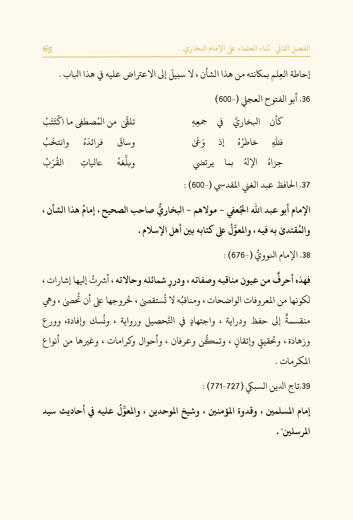 إمام المسلمين، وقدوة المؤمنين، وشيخ الموحدين، والمعوَّلُ عليه في أحاديث سيد المرسلين".