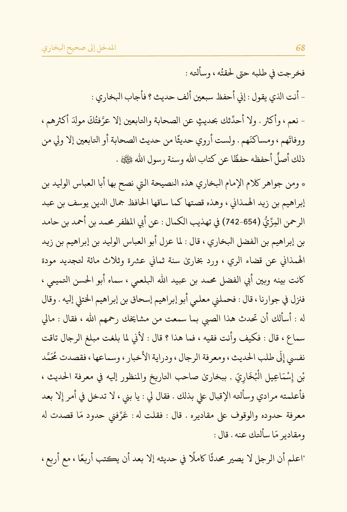 * ومن جواهر كلام الإمام البخاري هذه النصيحة التي نصح بها أبا العباس الوليد بن إبراهيم بن زيد الهمذاني، وهذه قصتها كما ساقها الحافظ جمال الدين يوسف بن عبد الرحمن المِزِّيُّ (٦٥٤ - ٧٤٢) في تهذيب الكمال: عن أبي المظفر محمد بن أحمد بن حامد بن إبراهيم بن الفضل البخاري، قال: لما عزل أبو العباس الوليد بن إبراهيم بن زيد الهمذاني عن قضاء الري، ورد بخارى سنة ثماني عشرة وثلاث مائة لتجديد مودة كانت بينه وبين أبي الفضل محمد بن عبيد الله البلعمي، سماه أبو الحسن التميمي، فنزل في جوارنا، قال: فحملني معلمي أبو إبراهيم إسحاق بن إبراهيم الختلي إليه. وقال له: أسألك أن تحدث هذا الصبي بما سمعت من مشايخك رحمهم الله، فقال: مالي سماع، قال: فكيف وأنت فقيه، فما هذا؟ قال: لأني لما بلغت مبلغ الرجال تاقت نفسي إِلَى طلب الحديث، ومعرفة الرجال، ودراية الأخبار، وسماعها، فقصدت مُحَمَّد بْن إِسْمَاعِيل الْبُخَارِيّ , ببخارى صاحب التاريخ والمنظور إليه في معرفة الحديث، فأعلمته مرادي وسألته الإقبال علي بذلك. فقال لي: يا بني، لا تدخل في أمر إِلا بعد معرفة حدوده والوقوف على مقاديره. قال: فقلت له.: عَرِّفني حدود مَا قصدت له ومقادير مَا سألتك عنه. قال:
