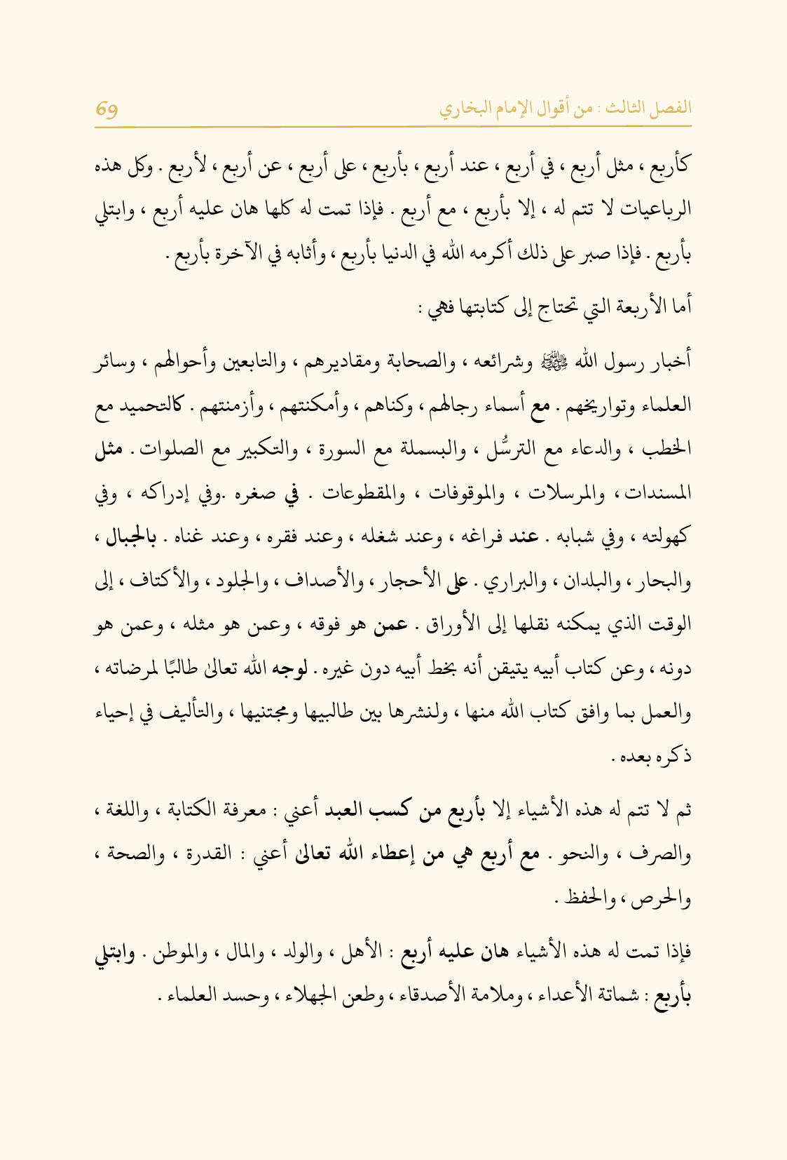 كأربع، مثل أربع، في أربع، عند أربع، بأربع، على أربع، عن أربع، لأربع. وكل هذه الرباعيات لا تتم له، إلا بأربع، مع أربع. فإذا تمت له كلها هان عليه أربع، وابتلي بأربع. فإذا صبر على ذلك أكرمه الله في الدنيا بأربع، وأثابه في الآخرة بأربع.