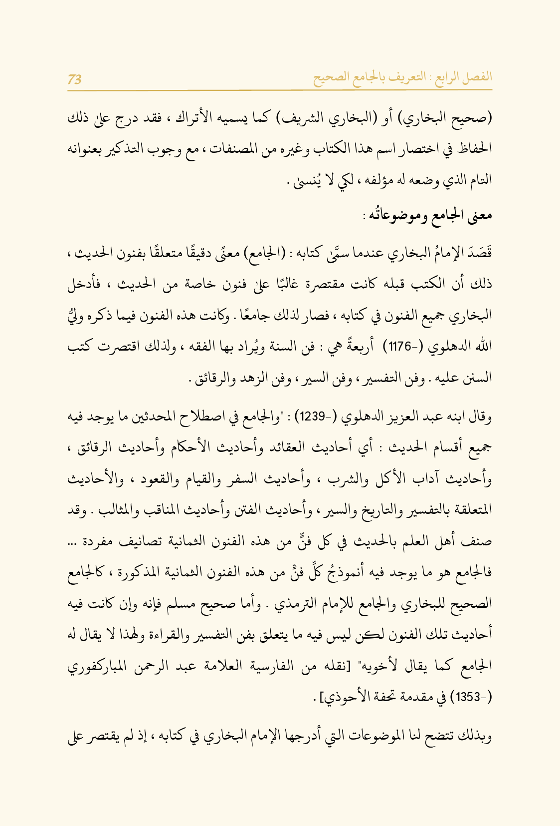 وقال ابنه عبد العزيز الدهلوي (-١٢٣٩): "والجامع في اصطلاح المحدثين ما يوجد فيه جميع أقسام الحديث: أي أحاديث العقائد وأحاديث الأحكام وأحاديث الرقائق، وأحاديث آداب الأكل والشرب، وأحاديث السفر والقيام والقعود، والأحاديث المتعلقة بالتفسير والتاريخ والسير، وأحاديث الفتن وأحاديث المناقب والمثالب. وقد صنف أهل العلم بالحديث في كل فنٍّ من هذه الفنون الثمانية تصانيف مفردة ... فالجامع هو ما يوجد فيه أنموذجُ كلِّ فنٍّ من هذه الفنون الثمانية المذكورة، كالجامع الصحيح للبخاري والجامع للإمام الترمذي. وأما صحيح مسلم فإنه وإن كانت فيه أحاديث تلك الفنون لكن ليس فيه ما يتعلق بفن التفسير والقراءة ولهذا لا يقال له الجامع كما يقال لأخويه" [نقله من الفارسية العلامة عبد الرحمن المباركفوري (-١٣٥٣) في مقدمة تحفة الأحوذي].