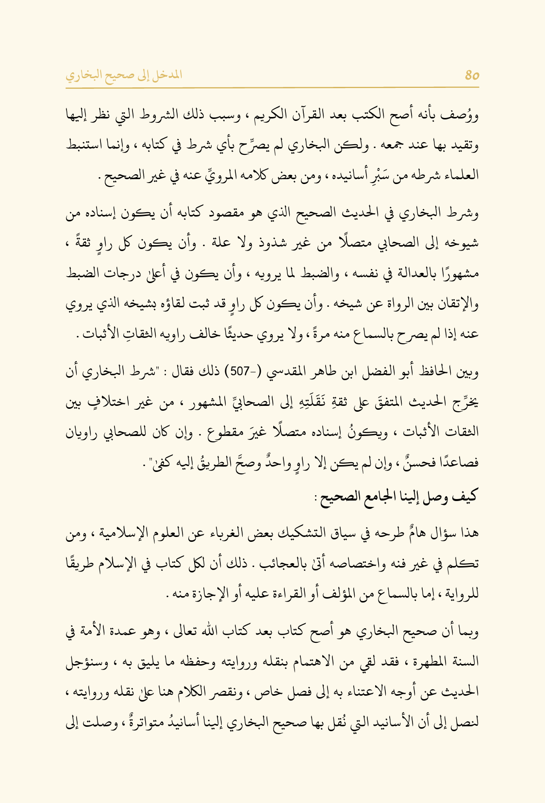 وبين الحافظ أبو الفضل ابن طاهر المقدسي (-٥٠٧) ذلك فقال: "شرط البخاري أن يخرِّج الحديث المتفقَ على ثقةِ نَقَلَتِهِ إلى الصحابيِّ المشهور، من غير اختلافٍ بين الثقات الأثبات، ويكونُ إسناده متصلًا غيرَ مقطوع. وإن كان للصحابي راويان فصاعدًا فحسنٌ، وإن لم يكن إلا راوٍ واحدٌ وصحَّ الطريقُ إليه كفى".