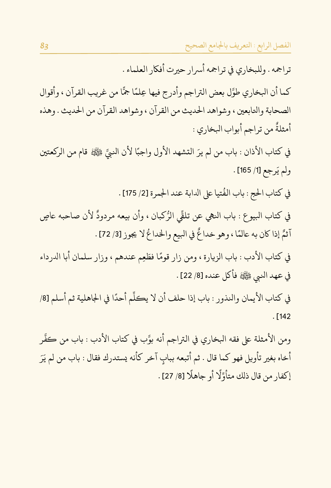 ومن الأمثلة على فقه البخاري في التراجم أنه بوَّب في كتاب الأدب: باب من كفَّر أخاه بغير تأويل فهو كما قال. ثم أتبعه ببابٍ آخر كأنه يستدرك فقال: باب من لم يَرَ إكفار من قال ذلك متأوِّلًا أو جاهلًا [٨/ ٢٧].