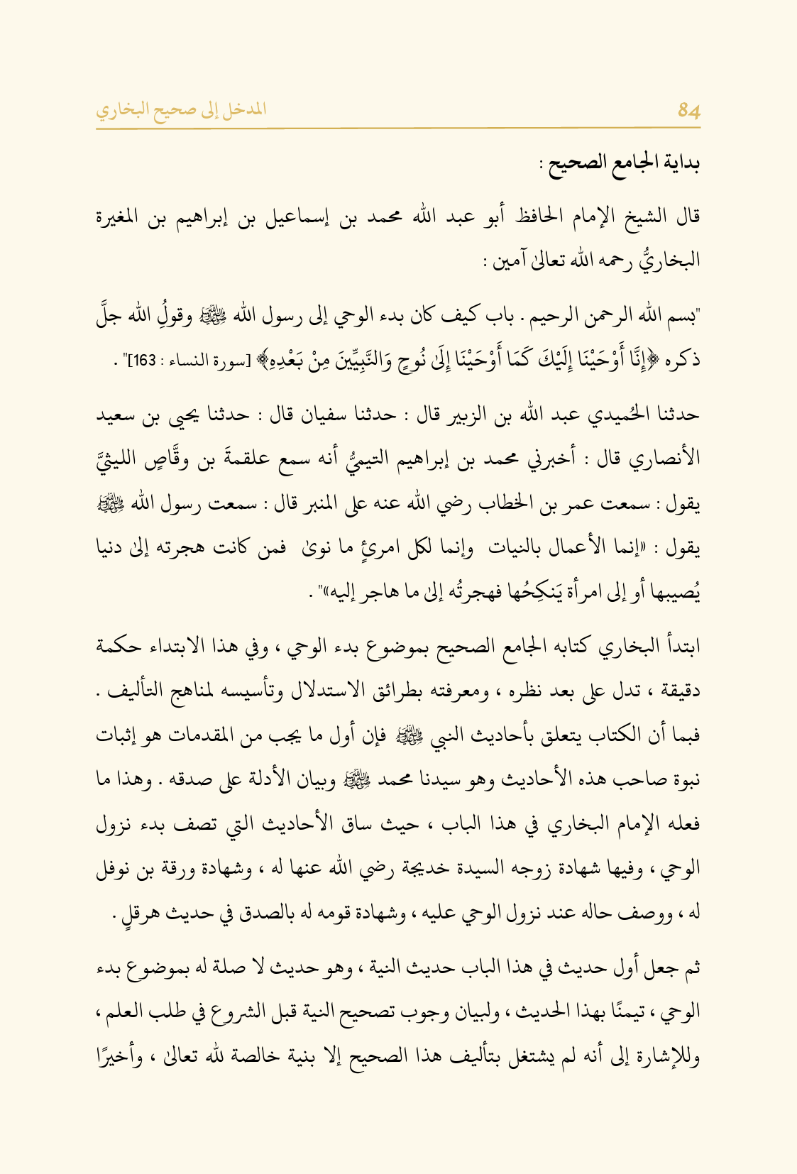 "بسم الله الرحمن الرحيم. باب كيف كان بدء الوحي إلى رسول الله - صلى الله عليه وسلم - وقولُ الله جلَّ ذكره {إِنَّا أَوْحَيْنَا إِلَيْكَ كَمَا أَوْحَيْنَا إِلَى نُوحٍ وَالنَّبِيِّينَ مِنْ بَعْدِهِ} [سورة النساء: ١٦٣] " ..