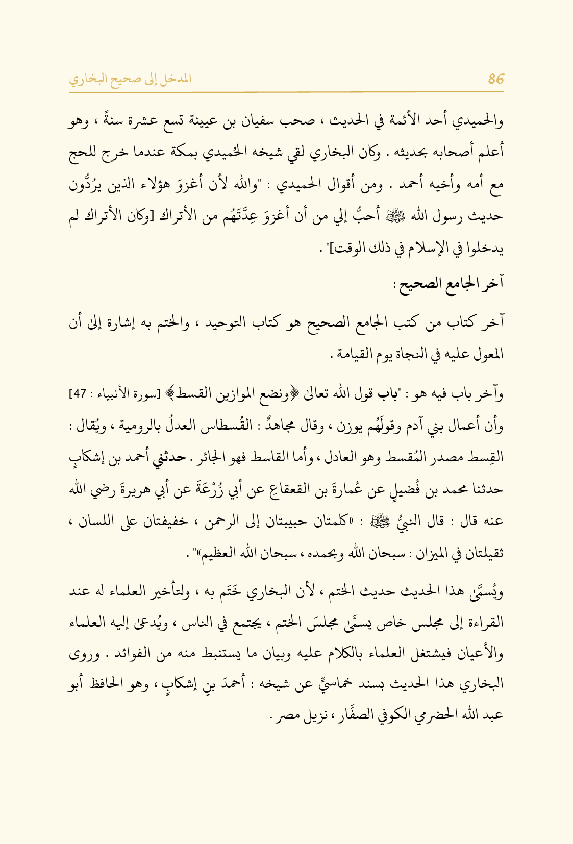 وآخر باب فيه هو: "باب قول الله تعالى {ونضع الموازين القسط} [سورة الأنبياء: ٤٧] وأن أعمال بني آدم وقولَهُم يوزن، وقال مجاهدٌ: القُسطاس العدلُ بالرومية، ويُقال: القِسط مصدر المُقسط وهو العادل، وأما القاسط فهو الجائر. حدثني أحمد بن إشكابٍ حدثنا محمد بن فُضيلٍ عن عُمارةَ بن القعقاعِ عن أبي زُرْعَةَ عن أبي هريرةَ رضي الله عنه قال: قال النبيُّ - صلى الله عليه وسلم -: «كلمتان حبيبتان إلى الرحمن، خفيفتان على اللسان، ثقيلتان في الميزان.: سبحان الله وبحمده، سبحان الله العظيم» ".