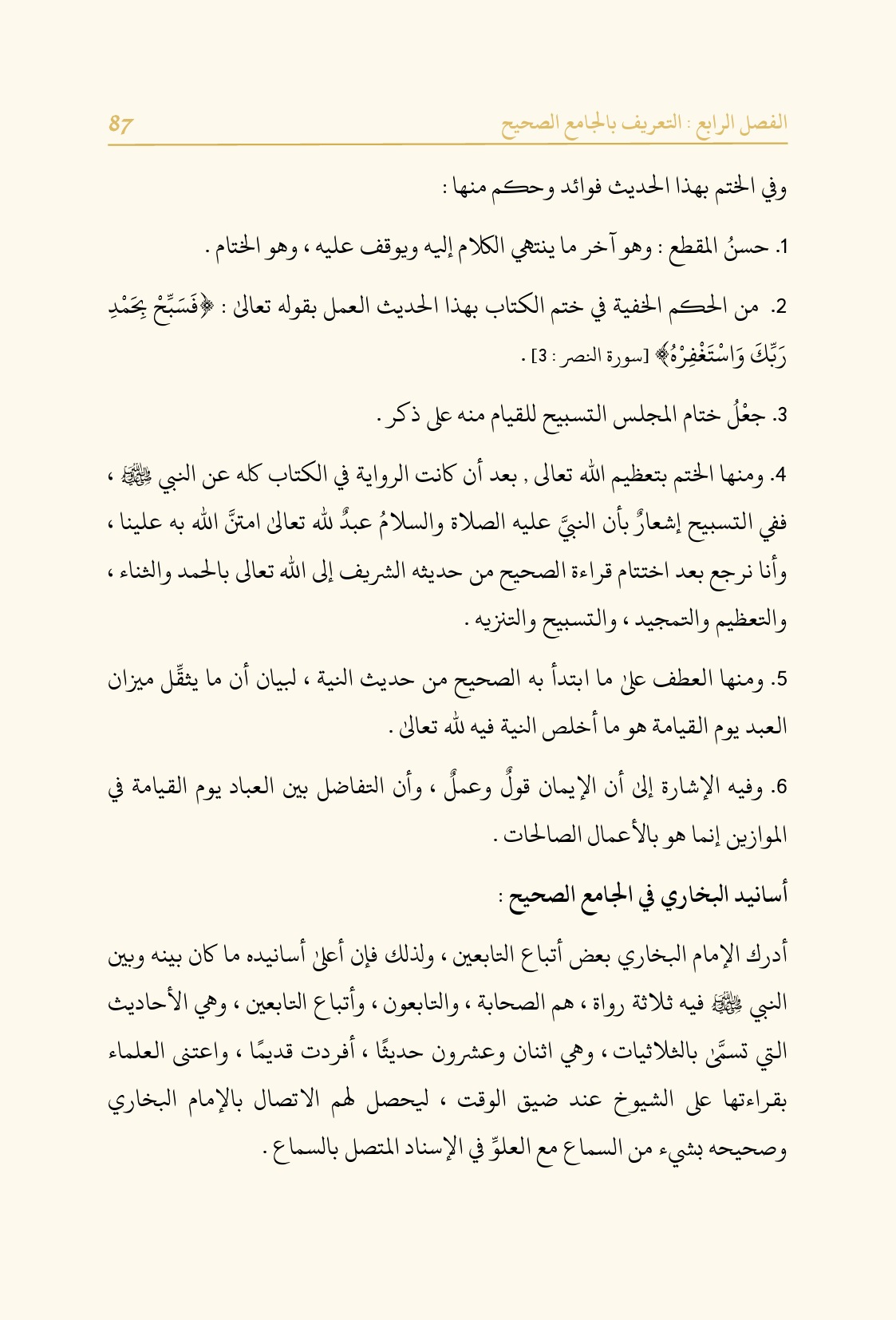 ٤. ومنها الختم بتعظيم الله تعالى , بعد أن كانت الرواية في الكتاب كله عن النبي - صلى الله عليه وسلم -، ففي التسبيح إشعارٌ بأن النبيَّ عليه الصلاة والسلامُ عبدٌ لله تعالى امتنَّ الله به علينا، وأنا نرجع بعد اختتام قراءة الصحيح من حديثه الشريف إلى الله تعالى بالحمد والثناء، والتعظيم والتمجيد، والتسبيح والتنزيه.