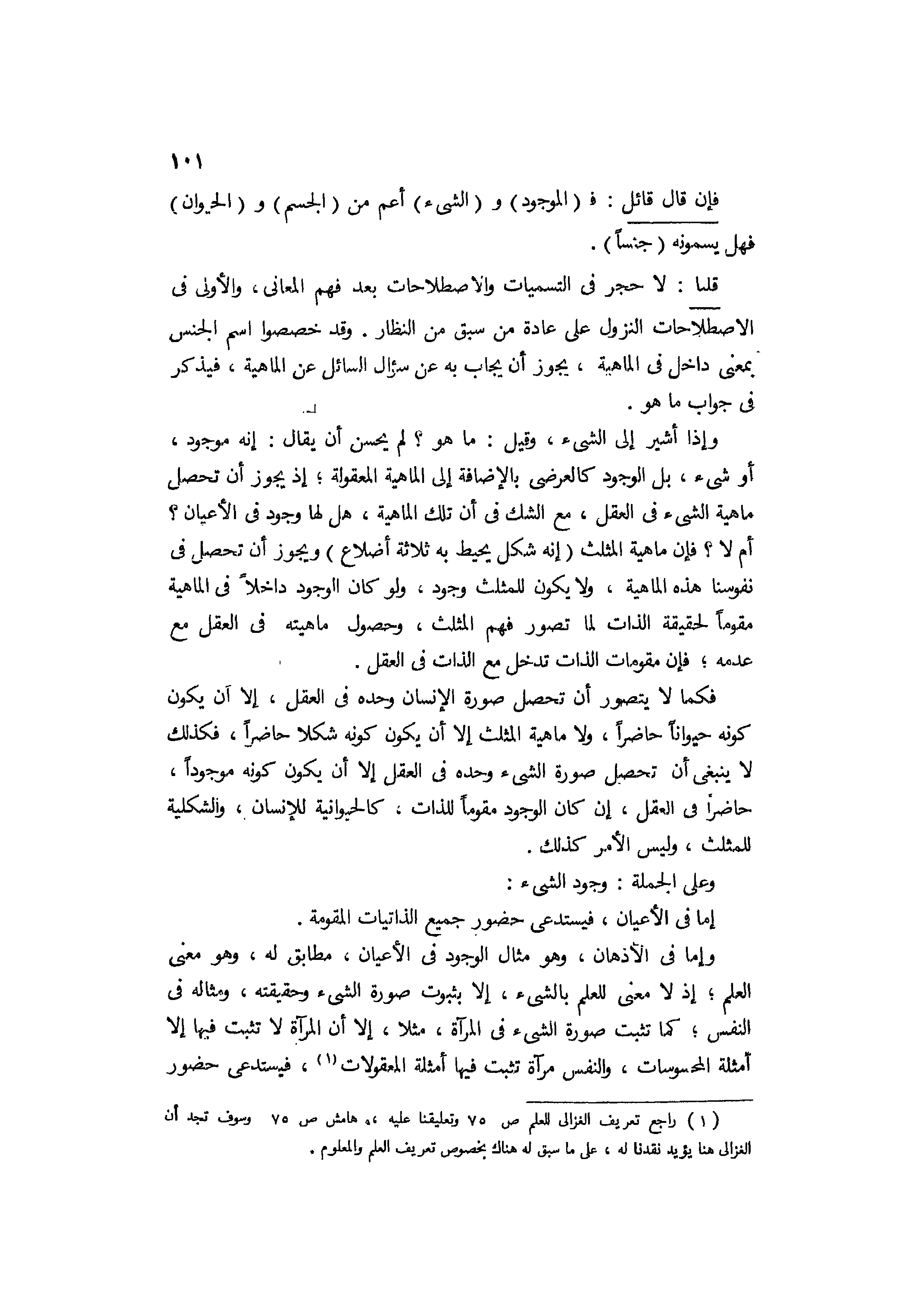 فإن قال قائل: فالموجود والشيء أعم من الجسم والحيوان فهل تسمونه جنسا؟ قلنا: لا حجر في التسميات والإصطلاحات بعد فهم المعاني، والأولى في الإصطلاحات النزول على عادة من سبق من النظار، وقد خصصوا إسم الجنس بمعنى داخل في الماهية يجوز أن يجاب به عن سؤال السائل عن الماهية، فيذكر في جواب ما هو، وإذا أشير إلى الشيء وقيل ما هو، لم يحسن ان يقال أنه موجود أو شيء بل الوجود كالعرضي بالإضافة إلى الماهية المعقولة، إذ يجوز أن تحصل ماهية الشيء في العقل مع الشك في أن تلك الماهية هل لها وجود في الأعيان أم لا، فإن ماهية المثلث أنه شكل يحيط به ثلاثة أضلاع، ويجوز أن يحصل في نفوسنا هذه الماهية ولا يكون للمثلث وجود، ولو كان الوجود داخلا في الماهية مقوما لحقيقة الذات لما تصور فهم المثلث وحصول ماهيته في العقل مع عدمه، فكمالا يتصور أن تحصل صورة الإنسان وحده في العقل إلا أن يكون كونه موجودا حاضرا في العقل، إن كان الوجود مقوما للذات كالحيوانية للإنسان والشكلية للمثلث، وليس الأمر كذلك. وعلى الجملة وجود الشيء أما في الأعيان فيستدعي حضور جميع الذاتيات المقومة، وأما في الأذهان وهو مثال الوجود في الأعيان مطابق له وهو معنى العلم إذ لا معنى للعلم بالشيء إلا بثبوت صورة الشيء وحقيقته ومثاله في النفس، كما تثبت صورة الشيء في المرآة مثلا إلا أن المرآة لا تثبت فيها إلا أمثلة المحسوسات، والنفس مرآة تثبت فيها أمثلة المعقولات فيستدعي حضور