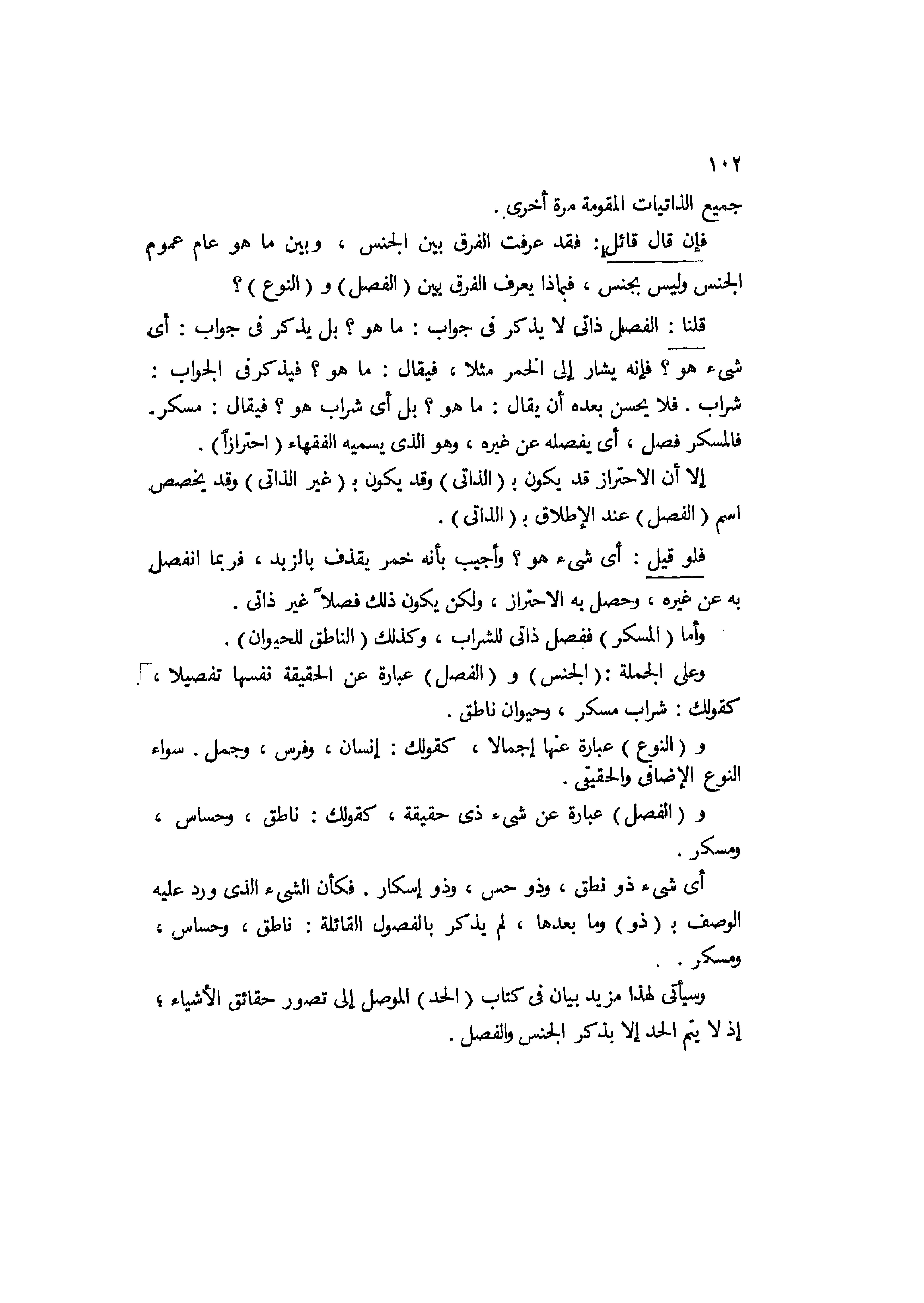 وعلى الجملة الجنس والفصل عبارة عن الحقيقة نفسها تفصيلا كقولك شراب مسكر وحيوان ناطق؛ والنوع عبارة عنها إجمالا كقولك إنسان وفرس وجمل سواء النوع الإضافي والحقيقي، والفصل عبارة عن شيء ذي حقيقة كقولك ناطق وحساس ومسكر أي شيء ذو نطق وذو حس وذو إسكار، فكان الشيء الذي ورد عليه الوصف بذو وما بعدها لم يذكر بالفصول القائلة ناطق وحساس ومسكر. وسيأتي لهذا مزيد بيان في كتاب الحد الموصل إلى تصور الأشياء، إذ لا يتم الحدّ إلا بذكر الجنس والفصل.