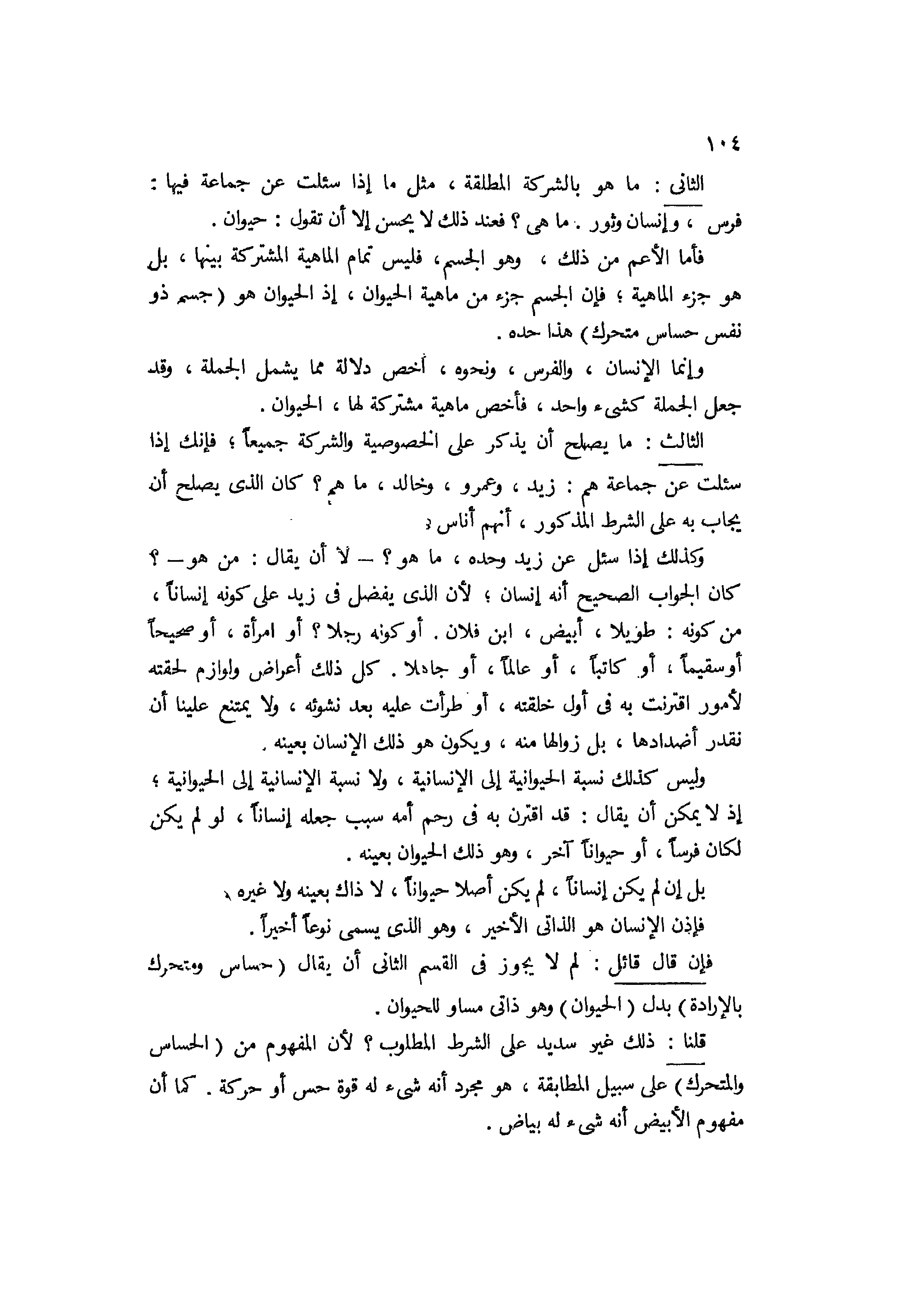 الثالث ما يصلح أن يذكر على الخصوصية والشركة جميعا، فإنك إذا سئلت عن جماعة هم زيد وعمرو وخالد: ما هم؟ كان الذي يصلح أن يجاب به على الشرط المذكور: إنهم أناس. وكذلك إذا سئل عن زيد وحده: ما هو؟ لا أن يقال: من هو؟ كان الجواب الصحيح: إنه إنسان، لأن الذي يفضل في زيد على كونه إنسانا من كونه طويلا أبيض ابن فلان، أو كونه رجلا أو إمرأة أو صحيحا أو سقيما أو كاتبا أوعالما أو جاهلا، كل ذلك أعراض ولوازم لحقته لأمور اقترنت به في أول خلقته أو طرأت عليه بعد نشوه، ولا يمتنع علينا أن نقدر أضدادها بل زوالها منه، ويكون هو ذلك الإنسان بعينه. وليس كذلك نسبة الحيوانية إلى الإنسانية، ولا نسبة الإنسانية إلى الحيوانية، إذ لا يمكن أن يقال قد اقترن به في رحم أمه سبب جعله إنسانا لو لم يكن لكان فرسا أو حيوانا آخر، وهو ذلك الحيوان بعينه، بل إن لم يكن إنسانالم يكن أصلا حيوانا لا ذاك بعينه ولا غيره، فإذن هو الذاتي الأخير وهوالذي يسمى نوعا أخيرا.