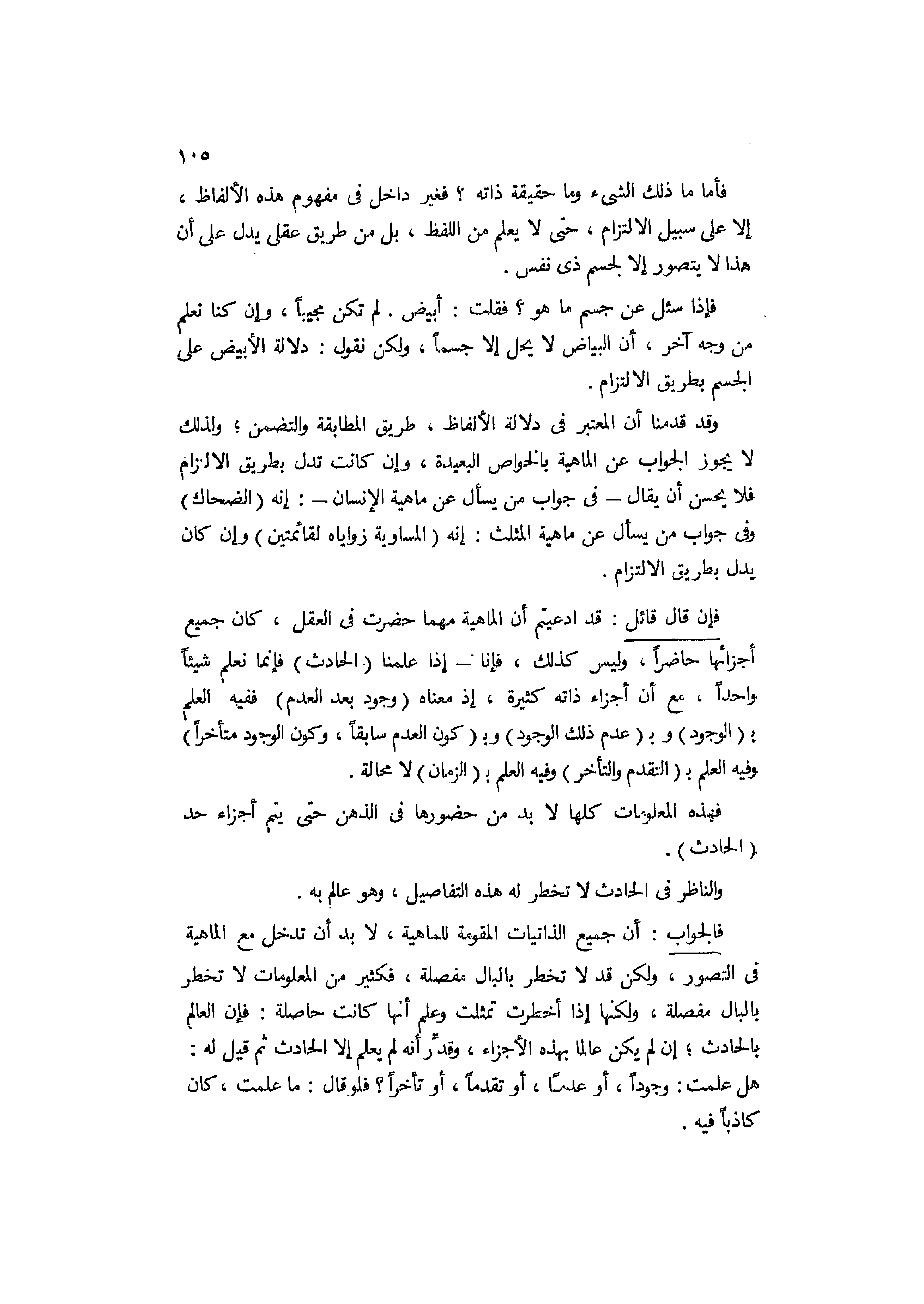 فالجواب أن جميع الذاتيات المقومة للماهية لا بد أن تدخل مع الماهية في التصور، ولكن قد لا تخطر بالبال مفصلة فكثير من المعلومات لا تخطر بالبال مفصلة، ولكنها إذا اخطرت تمثلت وعلم أنها كانت حاصلة، فإن العالم بالحادث أن لم يكن عالما بهذه الأجزاء وقدر أنه لم يعلم إلا الحادث ثم قيل له: هل علمت وجودا أو عدما أو تقدما أو تأخرا؟ فلو قال: ما علمت؛ كان كاذبا فيه.