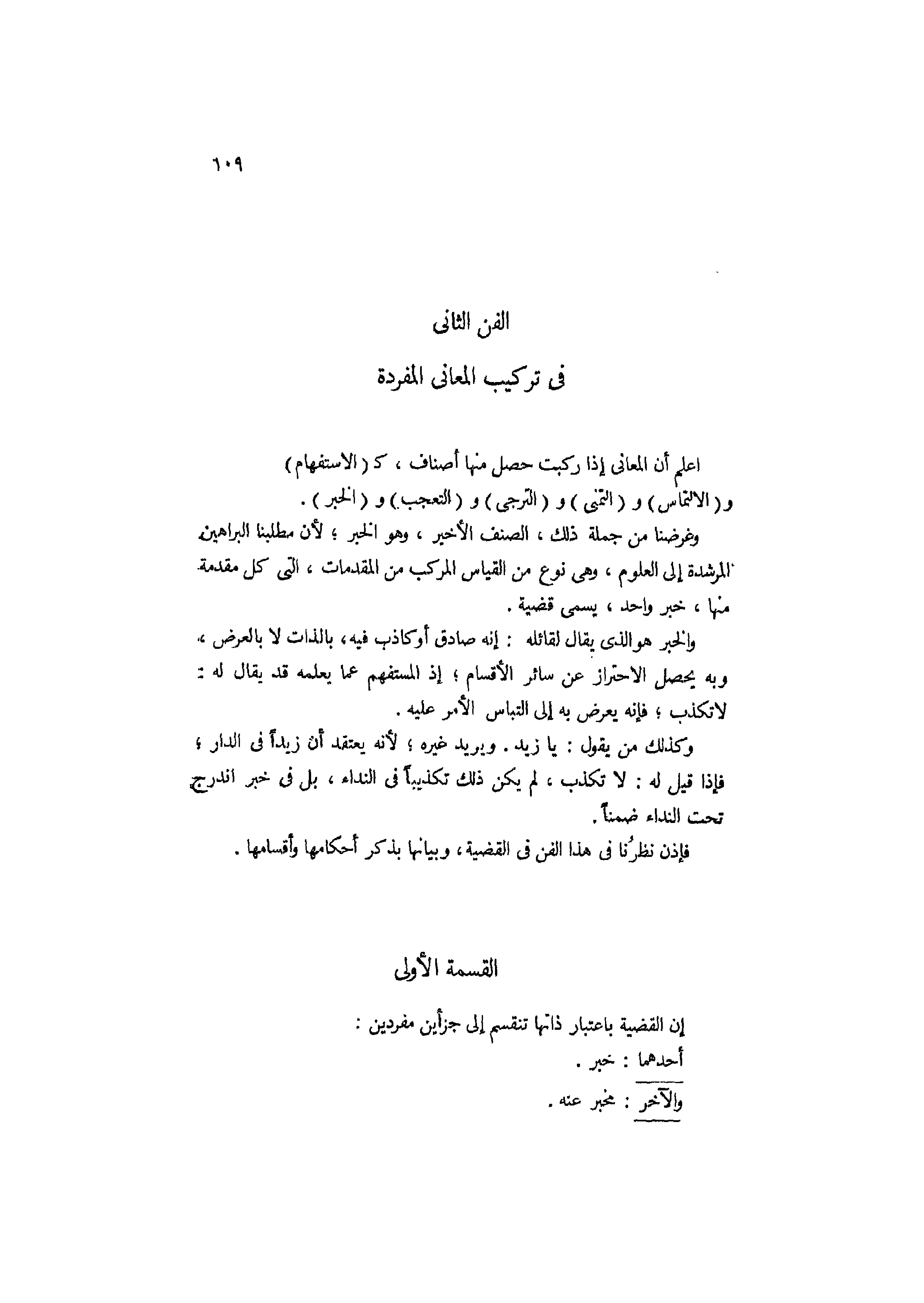 ؟؟ الفن الثاني في تركيب المعاني المفردة إعلم أن المعاني إذا ركبت حصل منها أصناف كالإستفهام والإلتماس والتمني والترجي والتعجب والخبر. وغرضنا من جملة ذلك الصنف الأخير وهو الخبر، لأن مطلبنا البراهين المرشدة إلىالعلوم وهي نوع من القياس المركب من المقدمات التي كل مقدمة منها خبر واحد يسمى قضية.