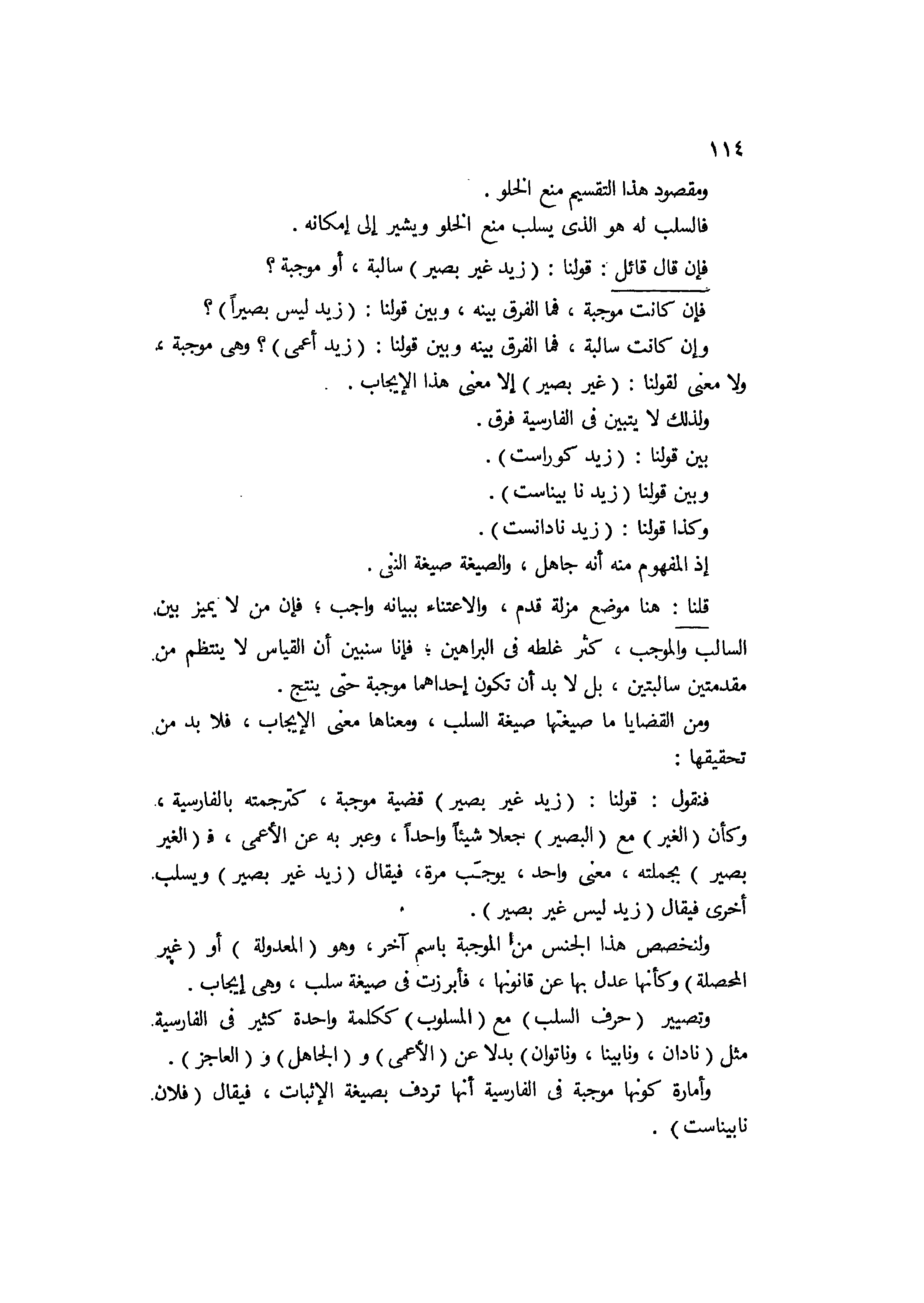 فإن قال قائل: قولنا زيد غير بصير سالبة أو موجبة؛ فإن كانت موجبة فما الفرق بينه وبين قولنا زيد ليس بصيرا؛ وإن كانت سالبة فما الفرق بينه وبين قولنا زيد ليس بصيرا؛ وإن كانت سالبة فما الفرق بينه وبين قولنا زيد أعمى وهي موجبة: ولا معنى لقولنا غير بصير إلا معنى هذا الإيجاب، ولذلك لا يتبين في الفارسية فرق بين قولنا: زيد كوراست " وبين قولنا " زيد نابيناست " وكذا قولنا " زيد نادانست " إذ المفهوم منه أنه جاهل والصيغة صيغة النفي.