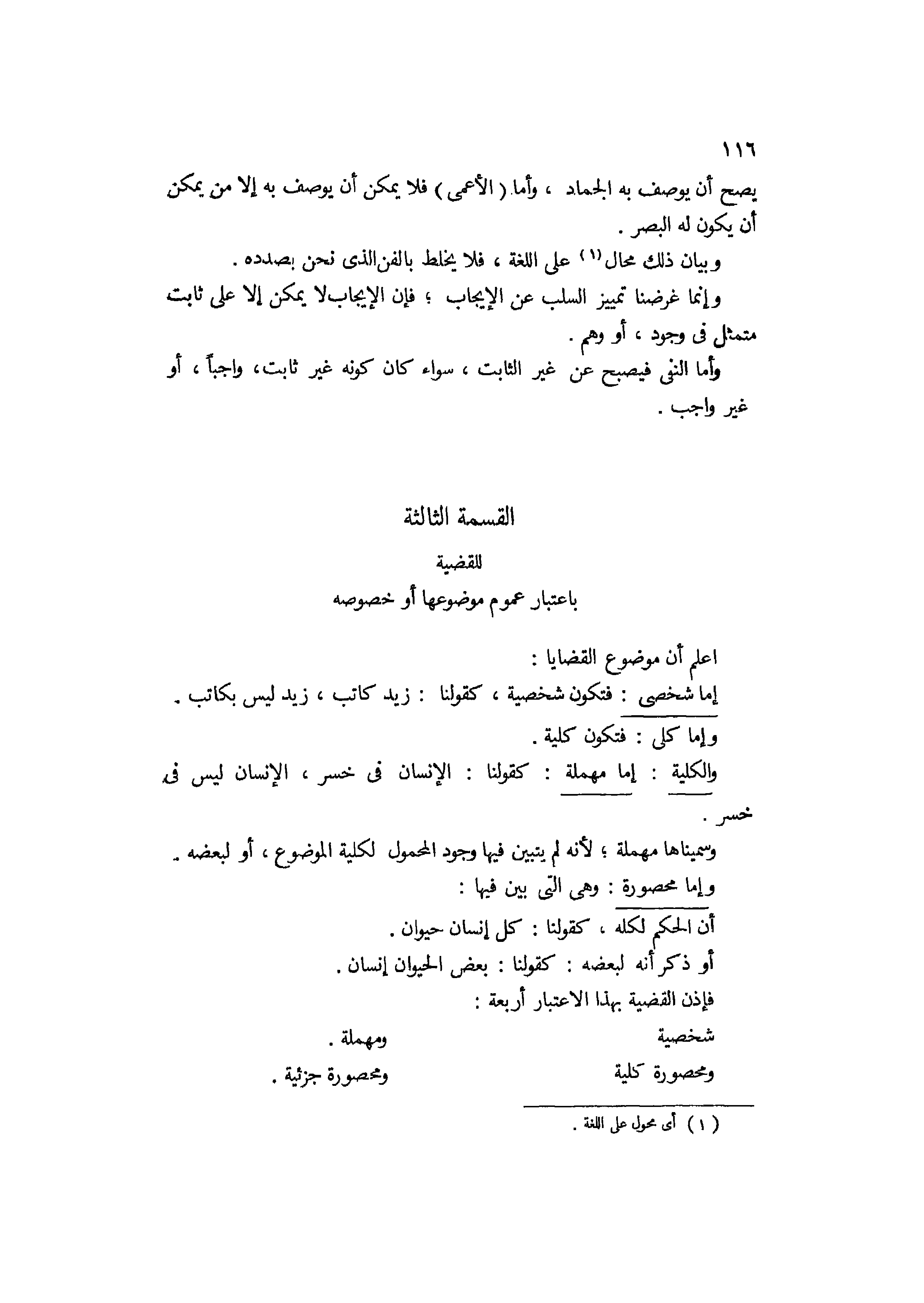 إعلم أن موضوع القضايا إما شخصي فتكون شخصية كقولنا زيد كاتب زيد ليس بكاتب، وإما كلي فتكون كلية، والكلية إما مهملة كقولنا الإنسان في خسر الإنسان في خسر. وسميناها مهملة لأنه لم يتبين فيها وجود المحمول لكية الموضوع أو لبعضه، وإما محصورة وهي التي بين فيها أن الحكم لكله كقولنا كل إنسان حيوان، أو ذكر إنه لبعضه كقولنا بعض الحيوان إنسان، فإذن القضية بهذا الإعتبار أربعة: شخصيةن ومهملة، ومحصورة كلية، ومحصورة جزئية.