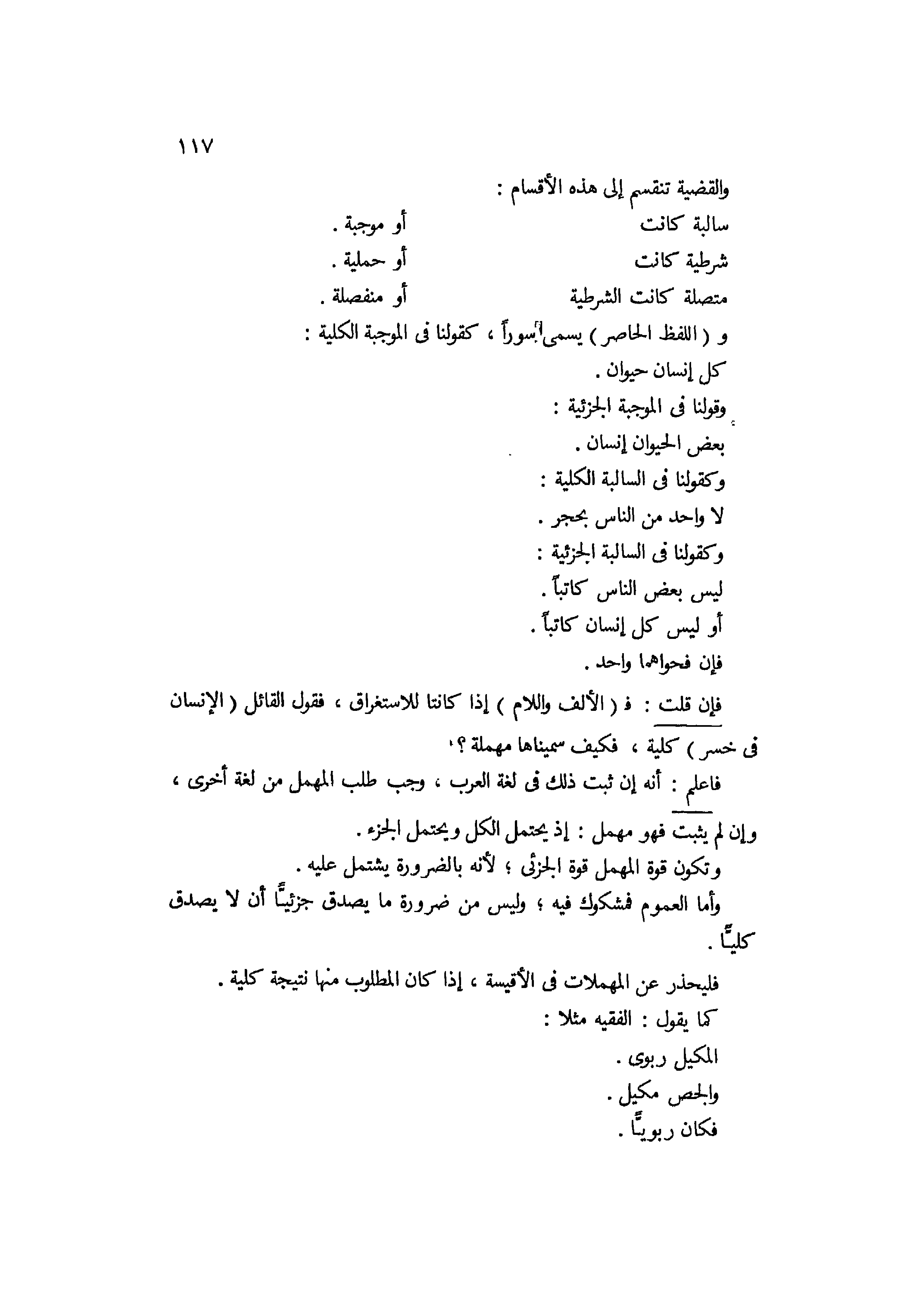 فإن قلت: فالألف واللام إذا كانتا للاستغراق فقول القائل الإنسان في خسر كلية فكيف سميناها مهملة؟ فاعلم أنه إن ثبت ذلك في لغة العرب وجب طلب المهمل من لغة أخرى، وإن لم يثبت فهو مهمل إذ يحتمل الكل ويحتمل الجزء، وتكون قوة المهمل قوة الجزئي لأنه بالضرورة يشتمل عليه. وأما العموم فمشكوك فيه، وليس من ضرورة ما يصدق جزئيا إلا يصدق كليا، فليحذر عن المهملات في الأقيسة إذا كان المطلوب منها نتيجة كلية، كما يقول الفقيه مثلا المكيل ربوي والجص مكيل