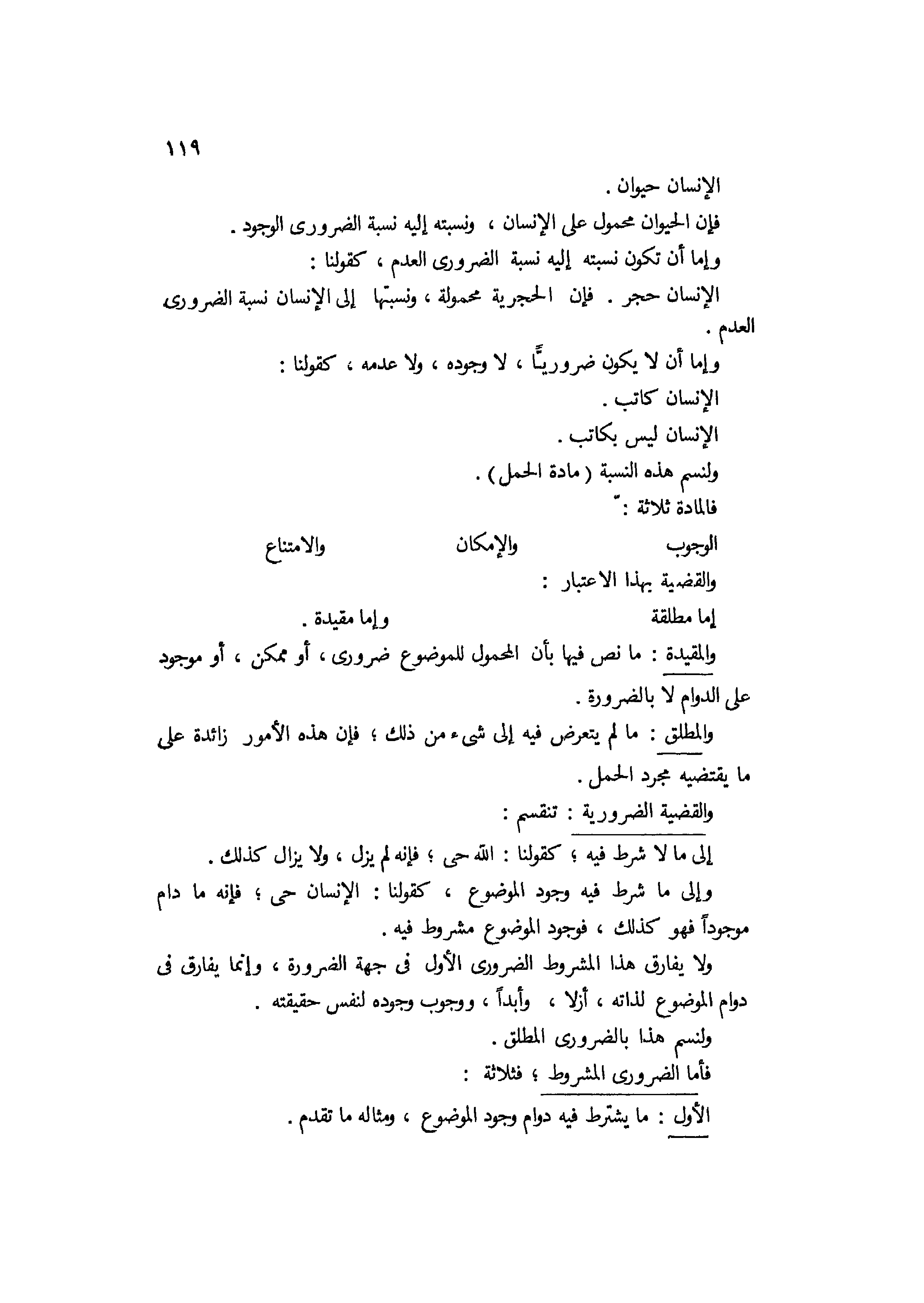 الإنسان حيوان، فإن الحيوان محمول على الإنسان ونسبته إليه نسبة الضروري الوجود، وأما أن يكون نسبته إليه نسبة الضروري العدم كقولنا الإنسان حجر فإن الحجرية محمولة، ونسبتها إلى الإنسان نسبة الضروري العد، وأما ألا يكون ضروريا لا وجوده ولا عدمه كقولنا الإنسان كاتب الإنسان ليس بكاتب، ولنسم هذه النسبة مادة الحمل، فالمادة ثلاثة: الوجوب والإمكان والإمتناع. والقضية بهذا الإعتبار أما مطلقة وإما مقيدة، والمقيدة ما نص فيها بأن المحمول للموضوع ضروري أو ممكن أو موجود على الدوام لا بالضرورة. والمطلق ما لم يتعرض فيه إلى شيء من ذلك، فإن هذه الأمور زائدة على ما يقتضيه مجرد الحمل، والقضية الضرورية تنقسم إلى ما لا شرط فيه كقولنا الله حي، فإنه لم يزل ولا يزال كذلك، وإلى ما شرط فيه وجود الموضوع كقولنا الإنسان حي، فإنه ما دام موجودا فهو كذلك، فوجود الموضوع مشروط فيه ولا يفارق هذا المشروط الضروري الأول في جهة الضرورة، وإنما يفارق في دوام الموضوع لذاته أزلا وأبدا ووجوب وجوده لنفس حقيقته، ولنسم هذا بالضروري المطلق.