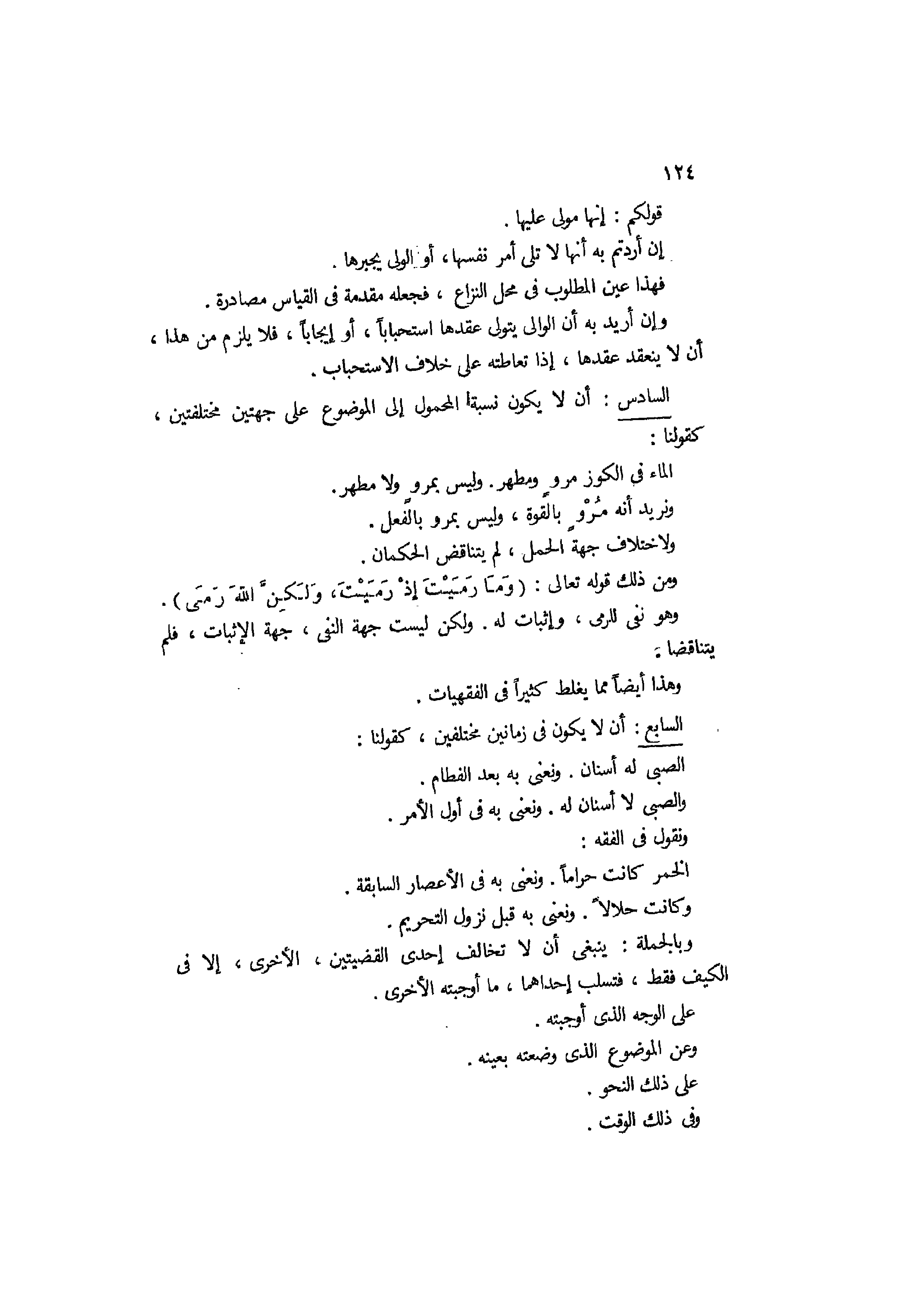 السادس ألا يكون نسبة المحمول إلى الموضوع على جهتين مختلفتين، كقولنا الماء في الكوز مرو مطهر وليس بمرو ولا مطهر، ونريد أنه مرو بالقوة وليس بمرو بالفعل، ولإختلاف جهة الحمل لم يتناقض الحكمان ومن ذلك قوله تعالى: (وَما رَميتَ إِذ رَمَيتَ وَلَكِنَّ الله رَمَى) وهو نفي للرمي وإثبات له، ولكن ليست جهة النفي جهة الإثبات فلم يتناقضا، وهذا أيضا مما يغلط كثيرا في الفقهيات.