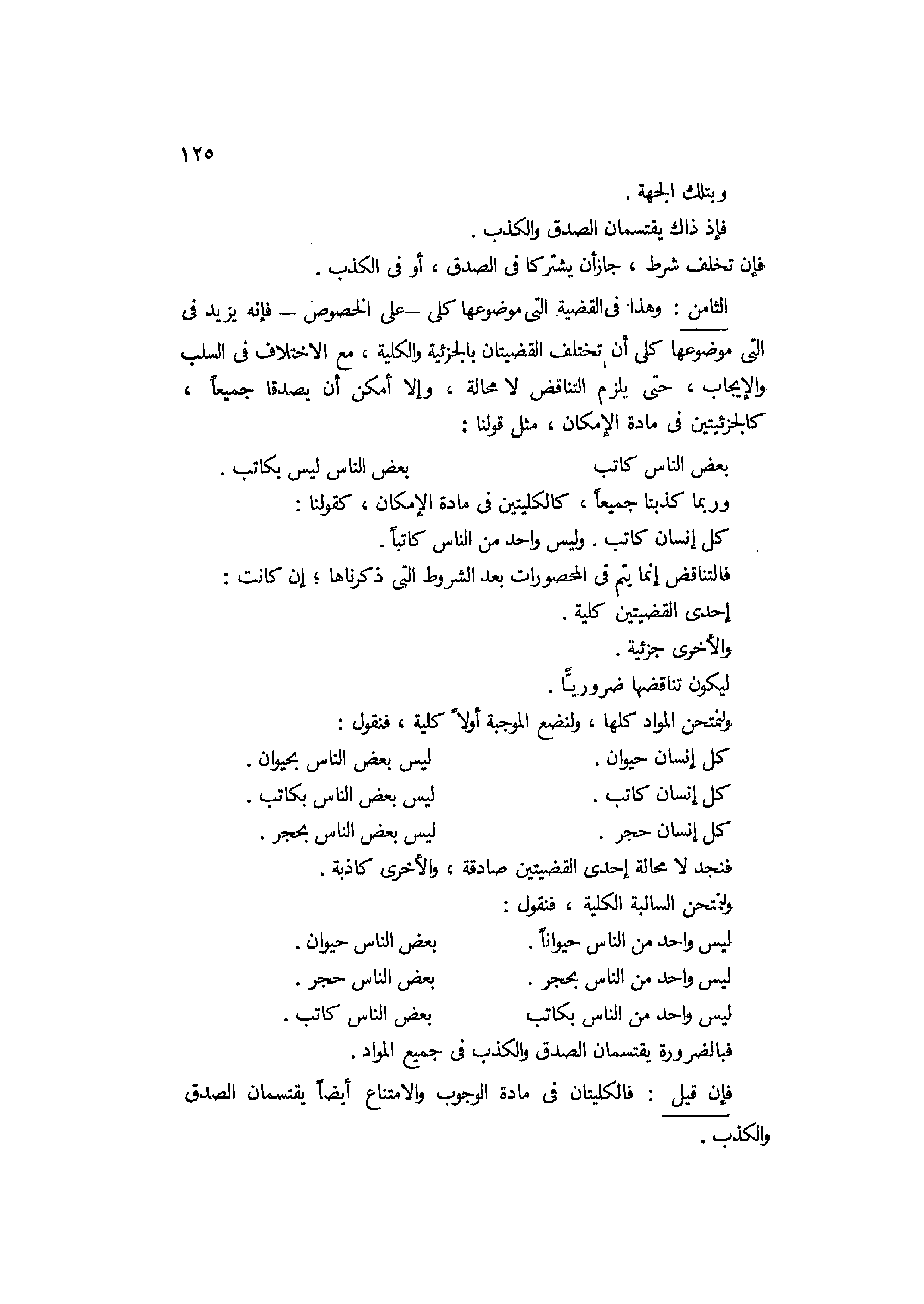 الثامن: وهذا في القضية التي موضوعها كلي على الخصوص، فإنه يزيد في التي موضوعها كلي أن يختلف القضيتان بالجزئية والكلية مع الإختلاف في السلب والإيجاب، حتى يلزم التناقض لا محالة، وإلا أمكن أن يصدقا جميعا كالجزئيتين في مادة الإمكان مثل قولنا بعض الناس كاتب بعض الناس ليس بكاتب، وربما كذبتا جميعا كالكليتين في مادة الإمكان كقولنا كل إنسان كاتب وليس واحد من الناس كاتبا؛ فالتناقض إنما يتم في المحصورات بعد الشروط التي ذكرناها إن كانت إحدى القضيتين كلية والأخرى جزئيتين في مادة الإمكان مثل قولنا بعض الناس كاتب بعض الناس ليس بكاتب، وربما كذبتا جميعا كالكليتين في مادة الإمكان كقولنا كل إنسان كاتب وليس واحد من الناس كاتبا؛ فالتناقض إنما يتم في المحصورات بعد الشروط التي ذكرناها إن كانت إحدى القضيتين كلية والأخرى جزئية، ليكون تناقضها ضروريا ولنمتحن المواد كلها ولنضع الموجبة أولا كلية فنقول: كل إنسان حيوان، ليس بعض الناس بحيوان؛ كل إنسان كاتب، ليس بعض الناس بكاتب؛ كل إنسان حجر، ليس بعض الناس بحجر؛ فنجد لا محالة إحدى القضيتين صادقة والأخرى كاذبة. ولنمتحن السالبة الكلية فنقول: ليس واحد من الناس حيوانا، بعض الناس حيوان؛ ليس واحد من الناس بحجر، بعض الناس حجر؛ ليس واحد من الناس بحجر، بعض الناس حجر؛ ليس واحد من الناس بكاتب، بعض الناس كاتب؛ فبالضرورة يقتسمان الصدق والكذب في جميع المواد. فإن قيل: فالكليتان في مادة الوجوب والإمتناع أيضا يقتسمان الصدق والكذب
